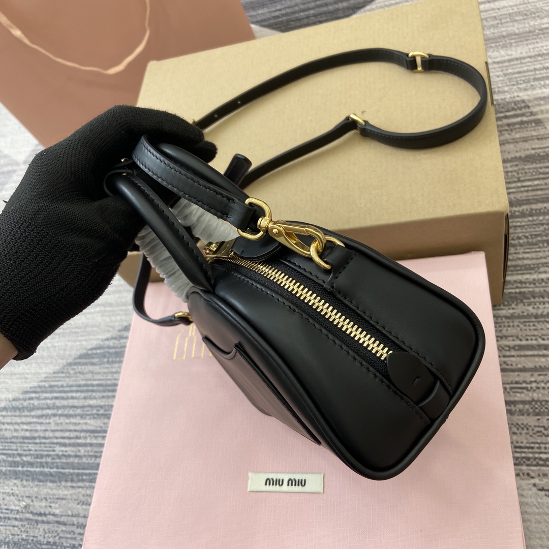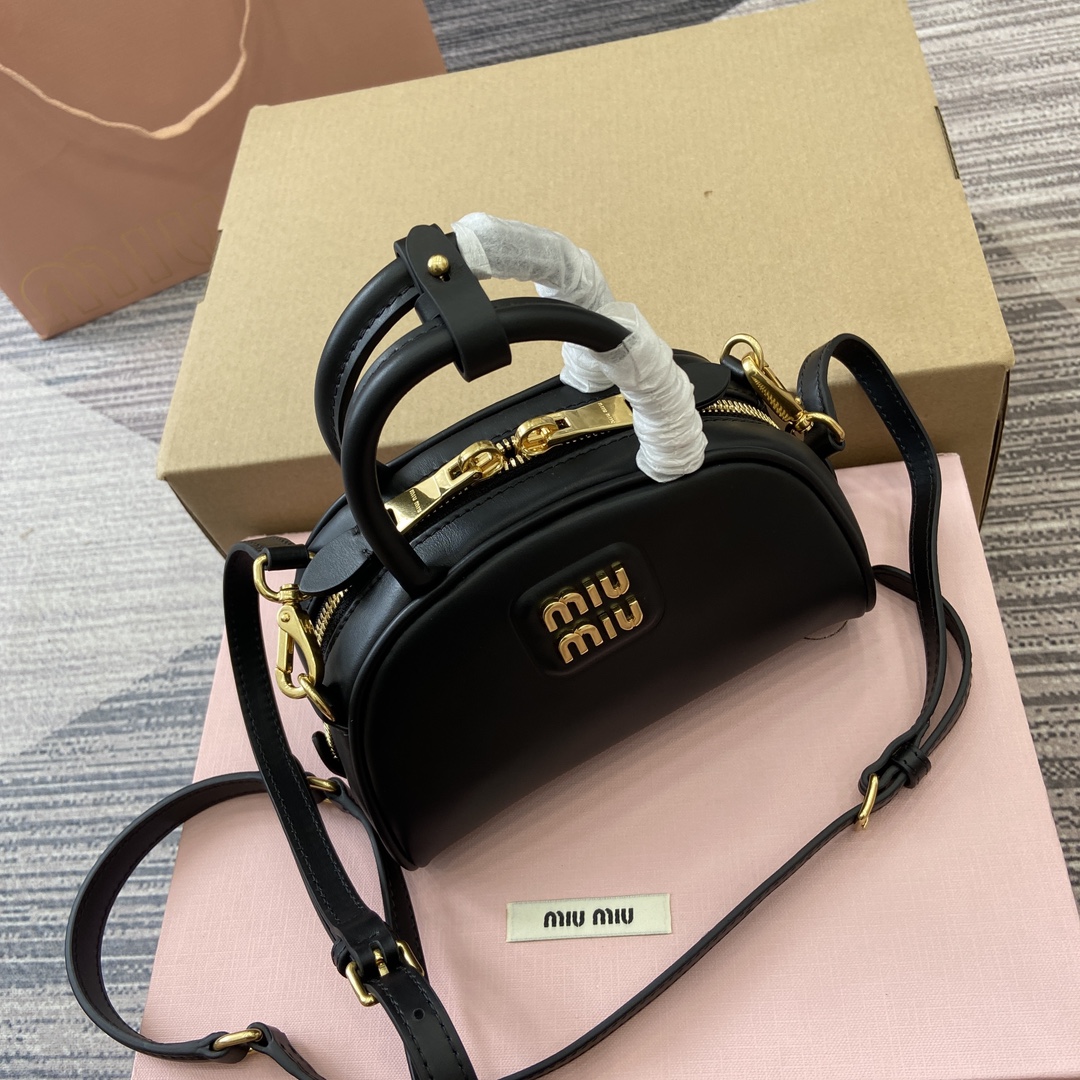 配全套专柜包装】‼️Miu家秀款饺子包,官网主推,今年绝对爆🔥款式,采用顶级进口小牛皮,时尚半圆设计,包身精致立体有型,风格百变,适配度很高,日常出行怎么搭都好看,正面标志性金属logo标,可拆卸可调节皮革长肩带,棉质缎面衬里,小号是精致的小可爱 型号:5BC085。 尺寸:18X11.5X8Cm 颜色:黑色全皮。 意大利创作