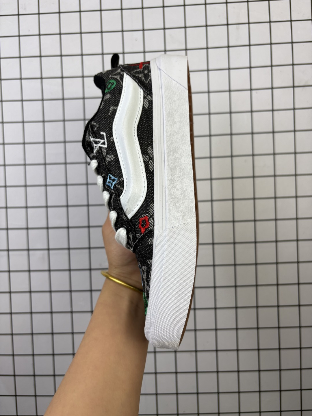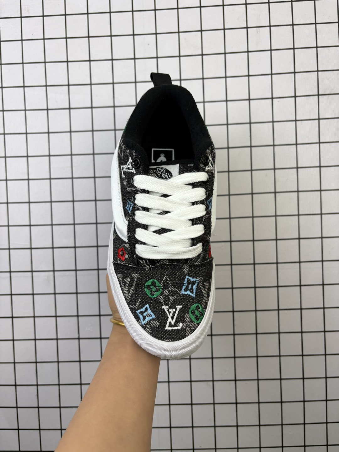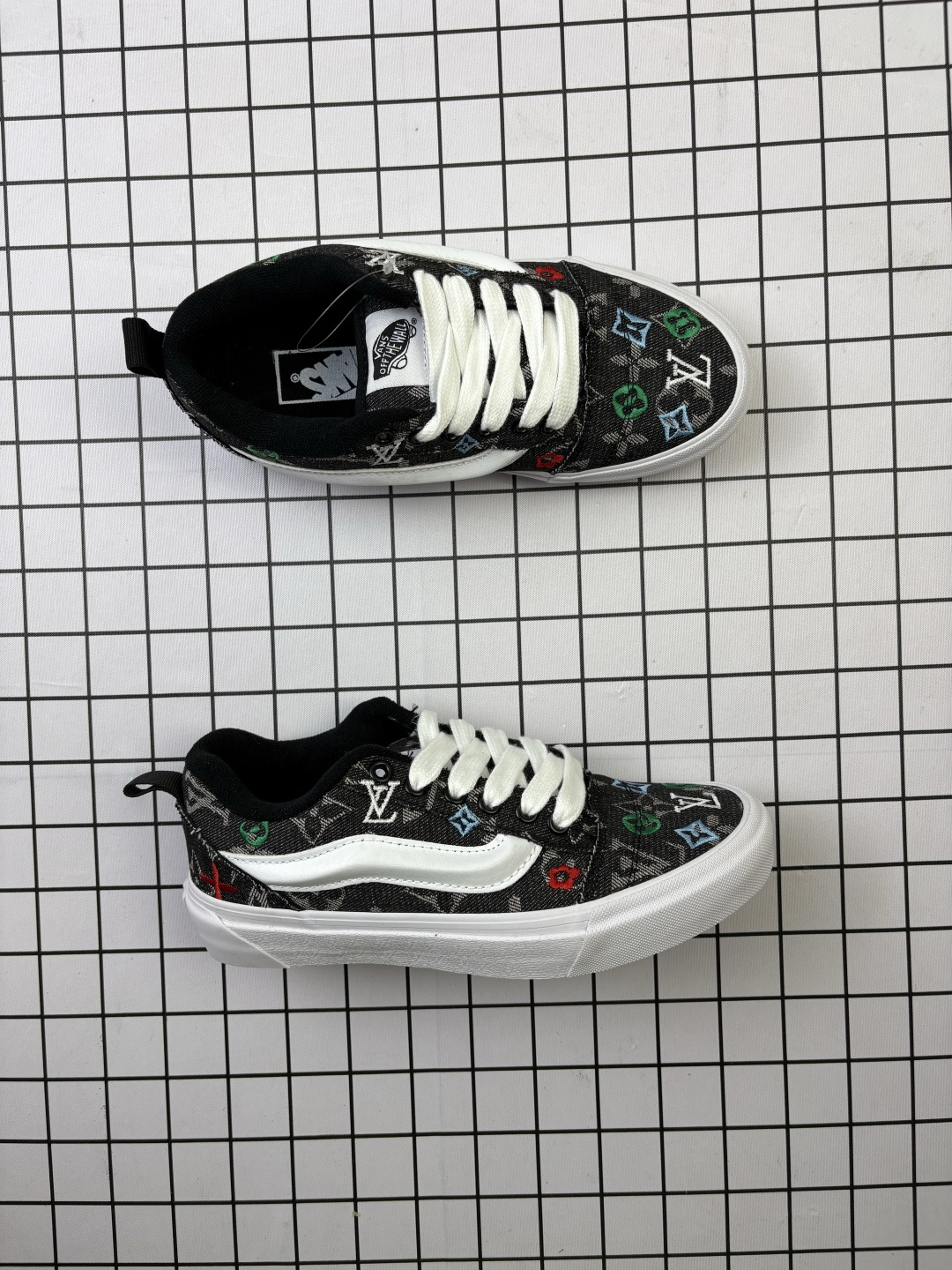 💰110 万斯LV和vans knu skool强强联合。鞋身LV提花+ 30个logo电绣爆款来袭,黑色电绣系震撼登场系列耐磨透气低帮板鞋男女同款 颜色:vans 联名LV电绣 货号:MZ牛仔蓝色格子 编码648 35-44