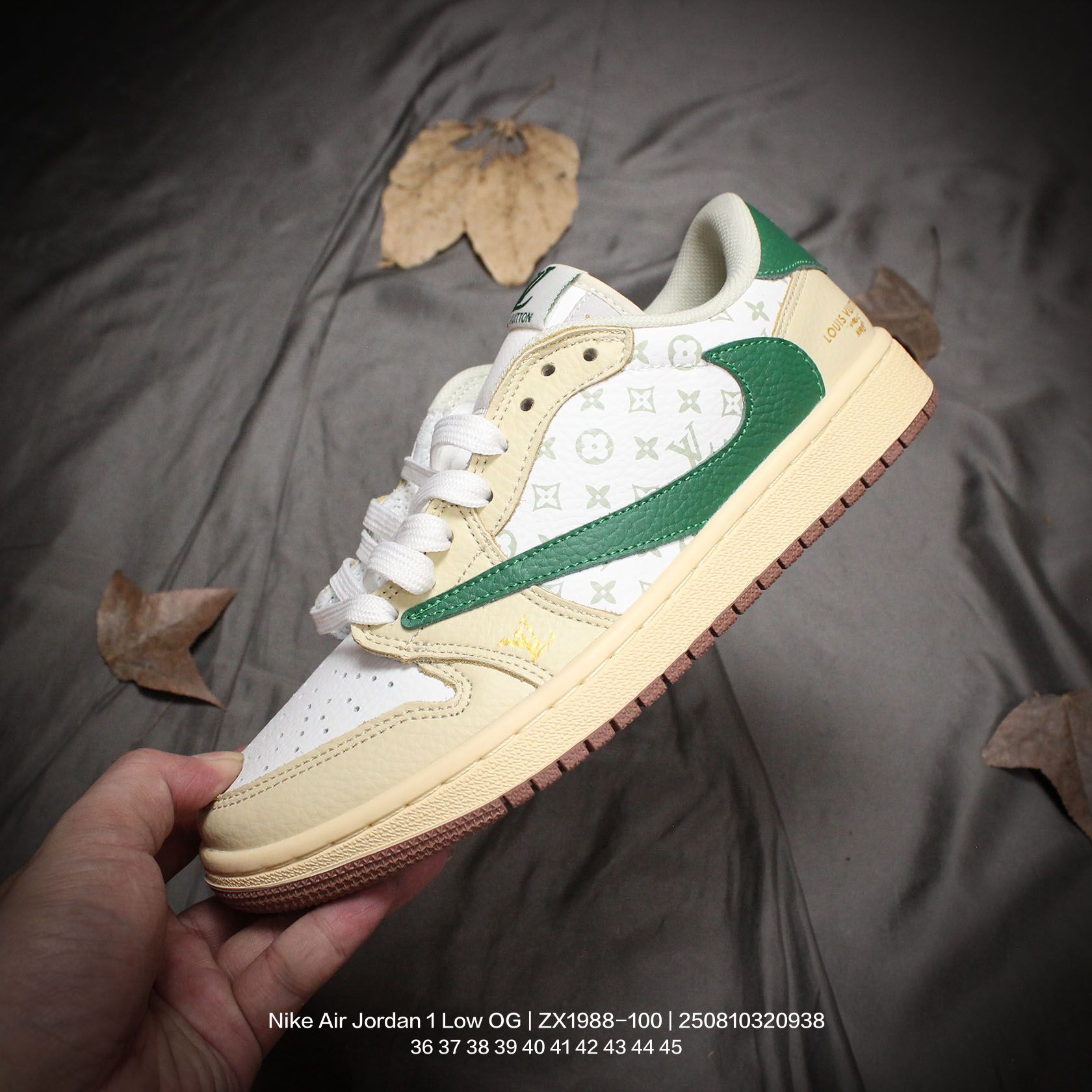 💰110 Jordan/乔丹 AJ1倒钩系列 男女鞋真标半码制,采用软质牛剖革组合猪巴革鞋面材质,缜密拉帮中底布,鞋垫嵌EVA缓震物料及背胶,内置气垫及耐磨橡胶大底❗️当红嘻哈歌手特拉维斯·斯科特定制联乘法国顶级高奢品牌·路易威登Louis Vuitton x Travis Scott x Nike Air Jordan 1 Low OG SP"Beige/Grey/ LV"AJ1乔丹一代经典低帮文化百搭休闲运动篮球鞋“TS联名米白棕深灰LV印花倒钩 ZX1988-100 类型:男女鞋 码数:36 37 38 39 40 41 42 43 44 45 编码:250810320.938