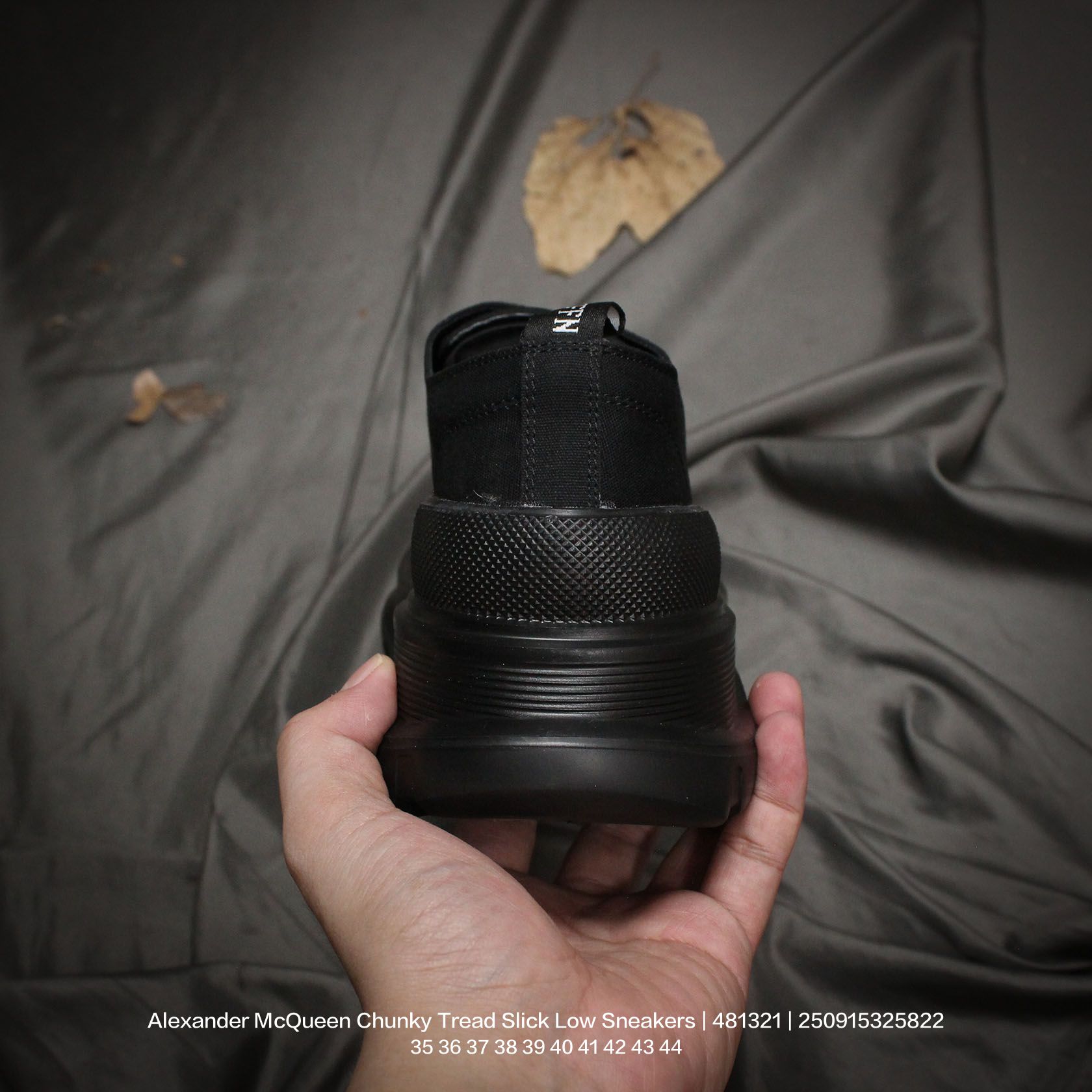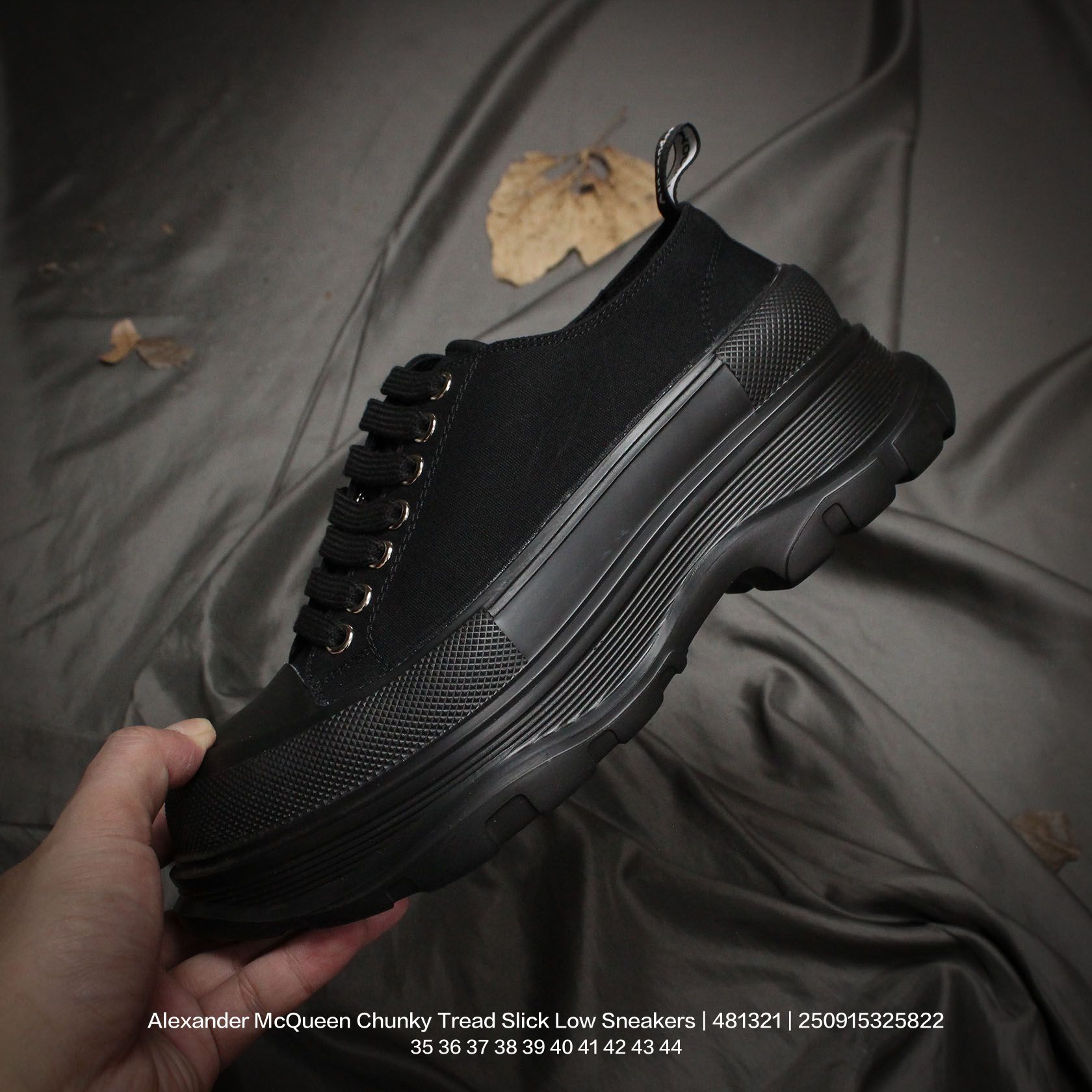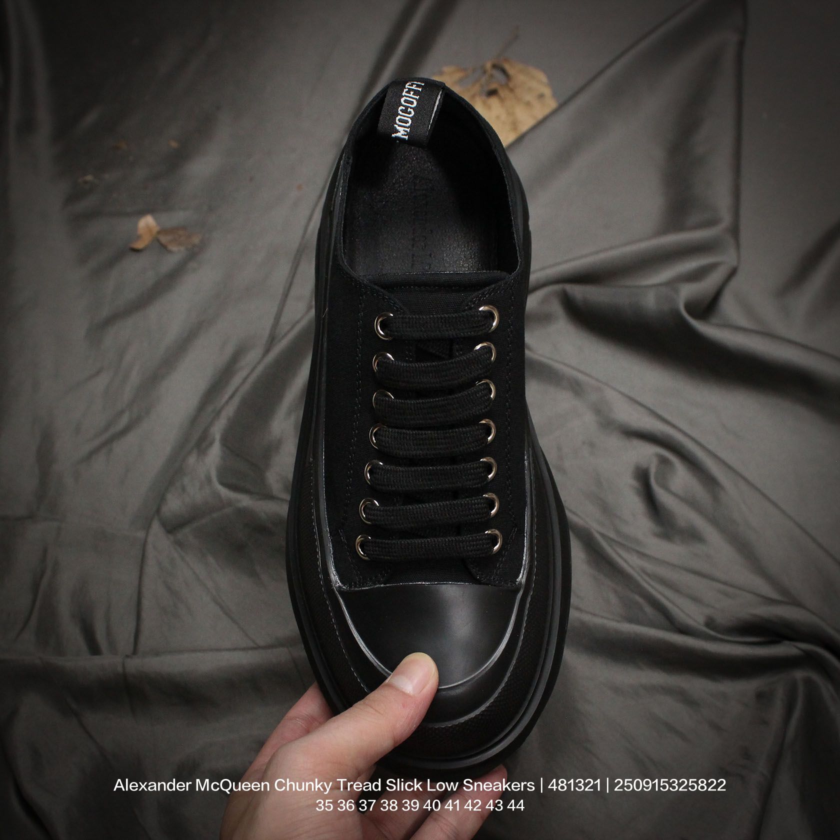 Alexander McQueen/亚历山大麦昆 采用进口全工艺耐磨帆布鞋面材质,内里小羊皮革贴附,鞋底贴合超软羊皮及乳胶PU缓震鞋垫,同源一致防锈处理五金鸡眼鞋带孔,原数据开发TPR三层组合鞋底模,光泽立体质感,明显增高4.0cm效果❗意大利高奢品牌亚历山大·麦昆Alexander McQueen Chunky Tread Slick Low Sneakers 胎纹面光泽底系列低帮老爹厚底松糕系带帆布休闲运动鞋 481321