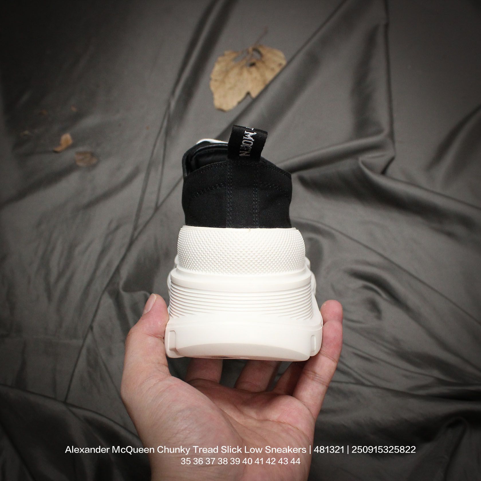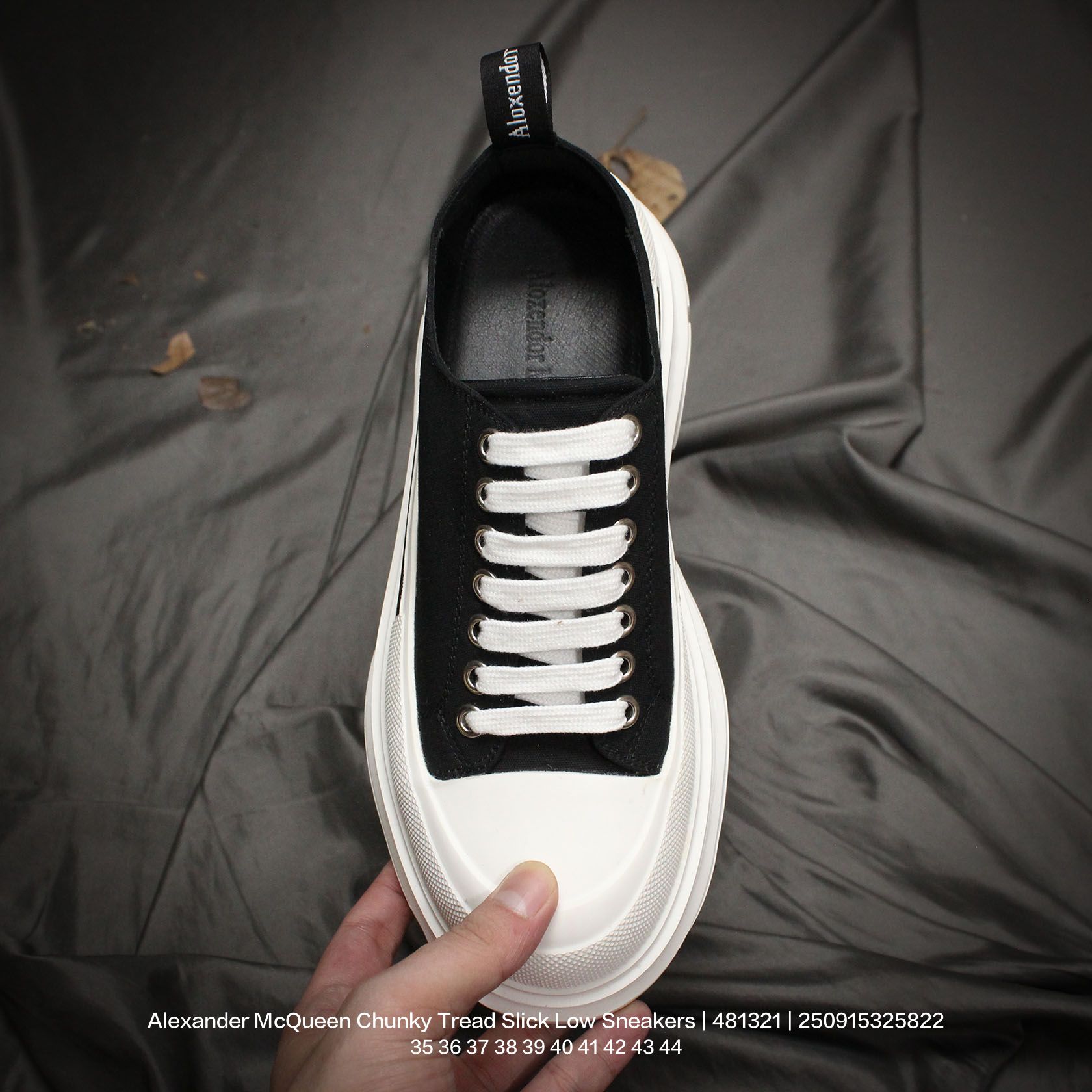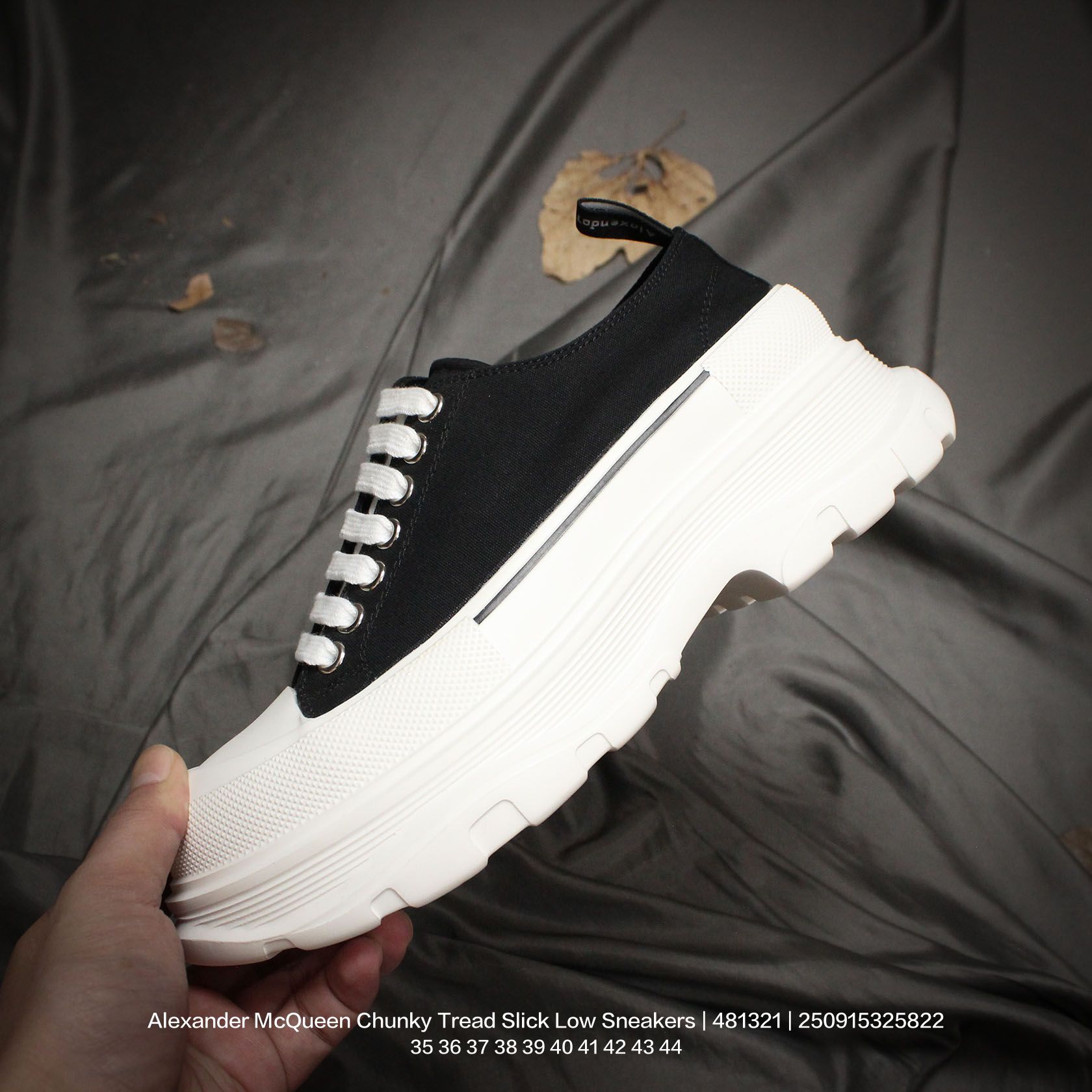 💰110 Alexander McQueen/亚历山大麦昆 采用进口全工艺耐磨帆布鞋面材质,内里小羊皮革贴附,鞋底贴合超软羊皮及乳胶PU缓震鞋垫,同源一致防锈处理五金鸡眼鞋带孔,原数据开发TPR三层组合鞋底模,光泽立体质感,明显增高4.0cm效果❗意大利高奢品牌亚历山大·麦昆Alexander McQueen Chunky Tread Slick Low Sneakers 胎纹面光泽底系列低帮老爹厚底松糕系带帆布休闲运动鞋 481321 类型:男女鞋 码数:35 36 37 38 39 40 41 42 43 44 编码:250915325.822