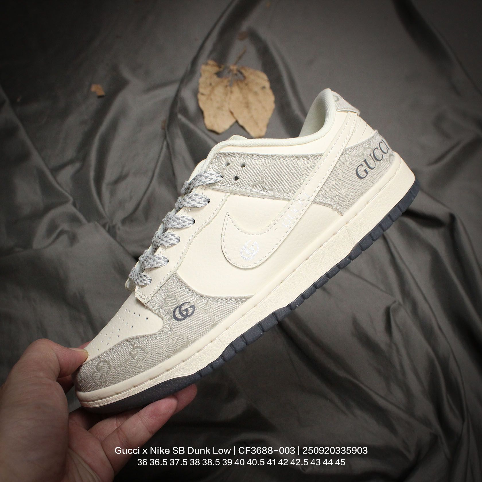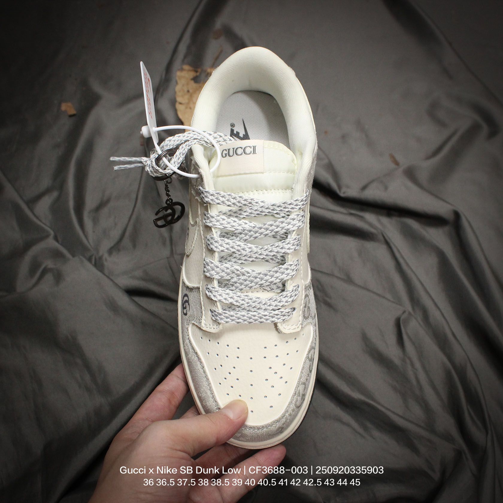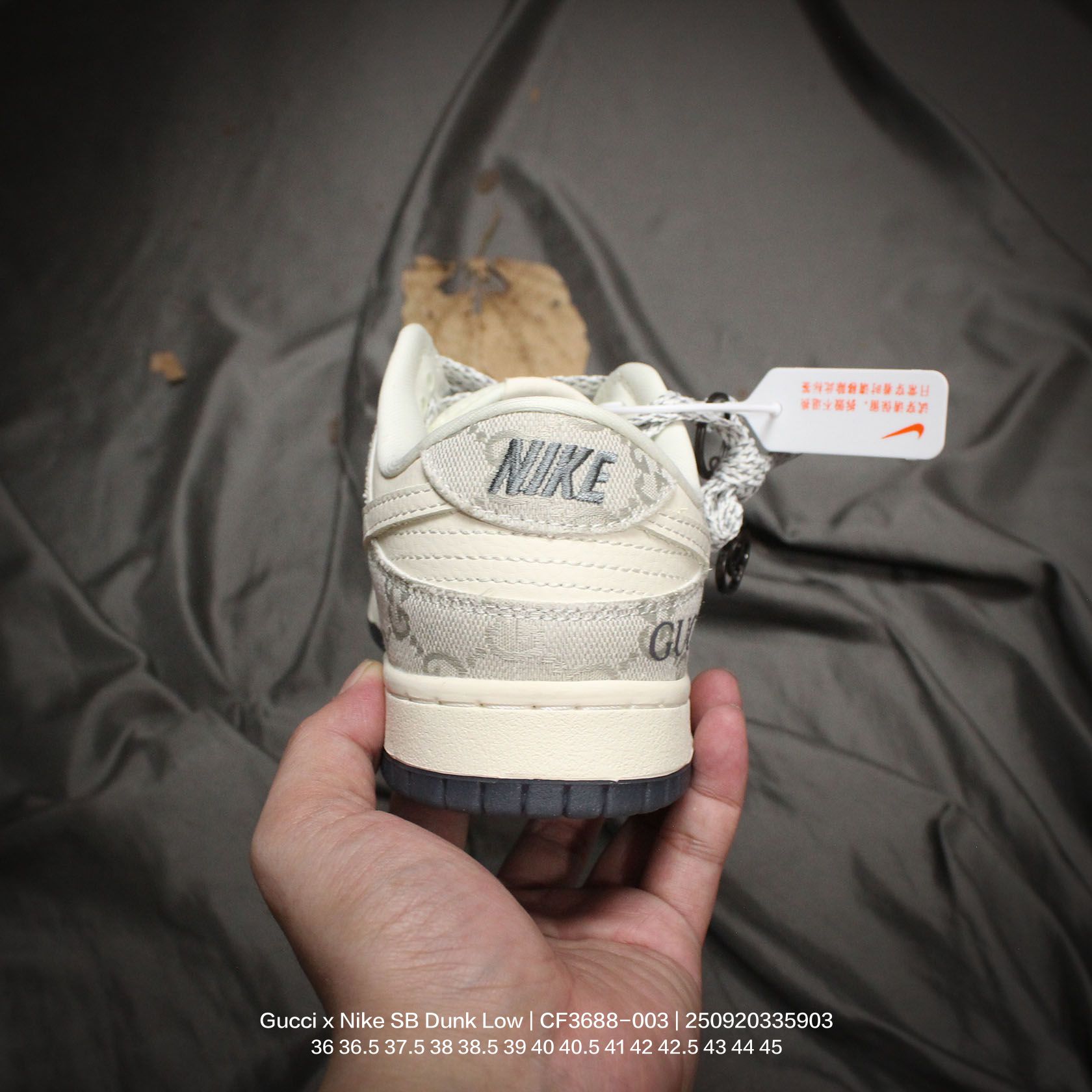 💰120 Nike/耐克 男女鞋真标半码制,全新2021版更新数据窄楦翘头版型,采用硬质牛剖革组合GG提花帆布鞋面材质,大厂水平严控清洁度,缜密拉帮中底布,鞋垫嵌EVA缓震物料及背胶,全新窄版翘头耐磨橡胶大底❗️创意定制配色,联乘意大利奢侈品牌-古驰Gucci x Nike SB Dunk Low"Esquisite Gucci"扣篮系列低帮休闲运动滑板板鞋“拼接奶白浅白GG布 CF3688-003 类型:男女鞋 码数:36 36.5 37.5 38 38.5 39 40 40.5 41 42 42.5 43 44 45 编码:250920335.903