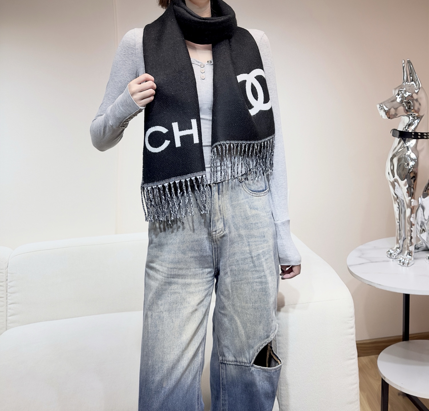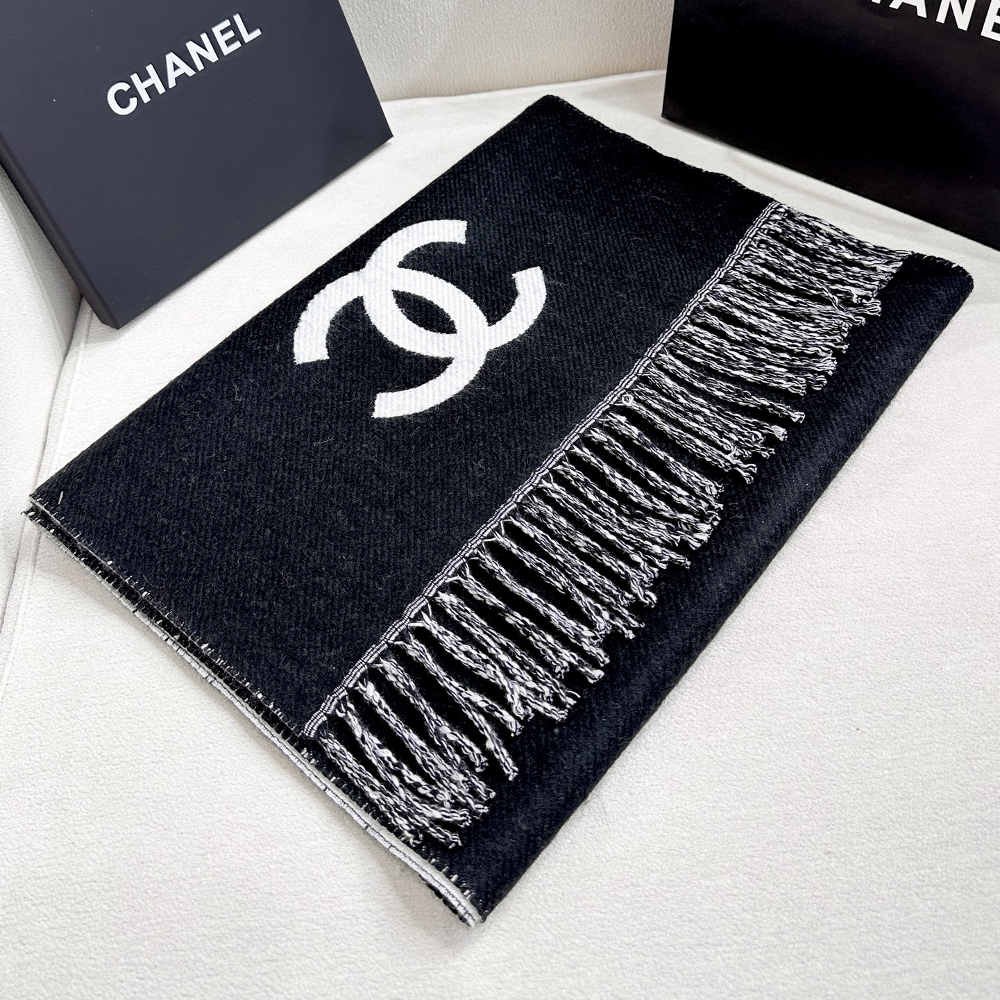P190 CHANEL限量顶级羊绒羊毛混纺披肩‼️专柜夏天就爆到断货。一直预定‼️极简的双C与英文LOGO提花,简洁大气,手感细腻柔软,超级舒服。 尺寸:44.6x168cm(不含穗) 成份:55%绵羊毛,45%山羊绒。 仅一色。值得入。