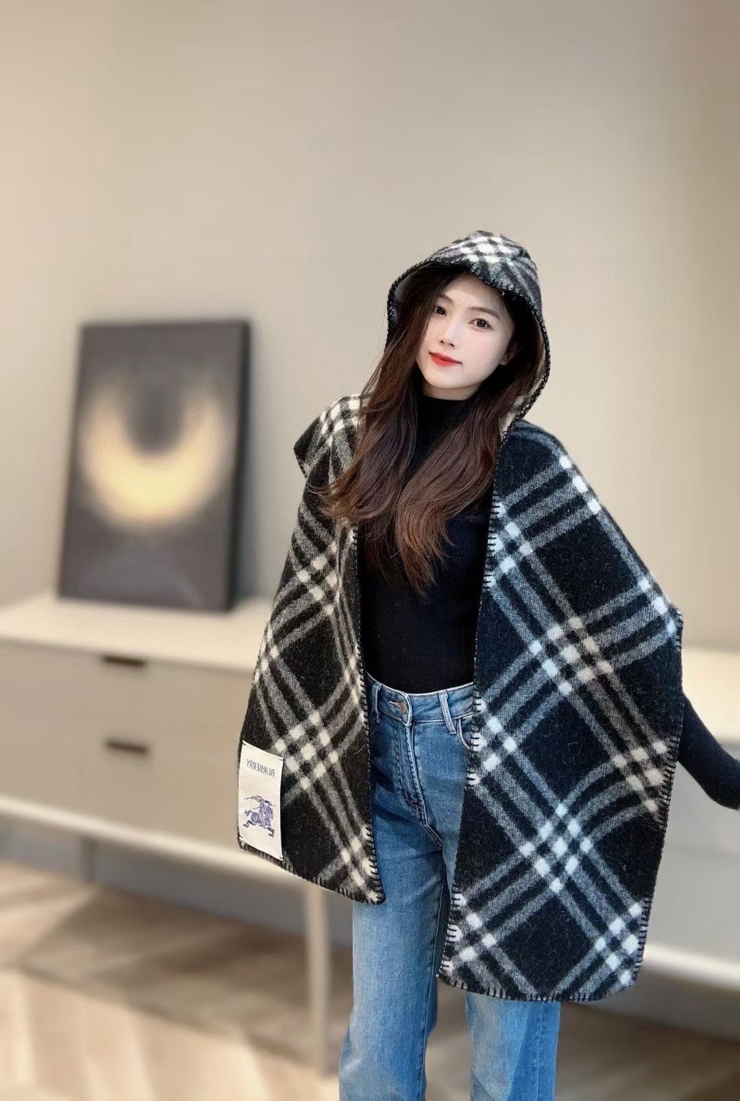 P180 P网红最新款Burberry家专属标识连帽小披肩,围巾披肩两用,绝对市面最牛的货,真材实料的东西,这款既可以当连帽披肩又可以当围巾,配上长筒靴超带范儿,美观性,舒适性与保暖性于一体,适合春秋冬三季,春秋早晚凉或者冬天寒冷时节穿着的绝佳单品。臻选最为柔软的羊毛羊绒精纺面料,披肩分外片和装饰,主要成分羊绒,达到百分之90以上就叫全羊绒了,所以标牌100%羊绒,整条斗篷柔软细腻,一点不扎,所有身材都能穿,随便驾驭,规格,180x30cm不含帽子尺寸.