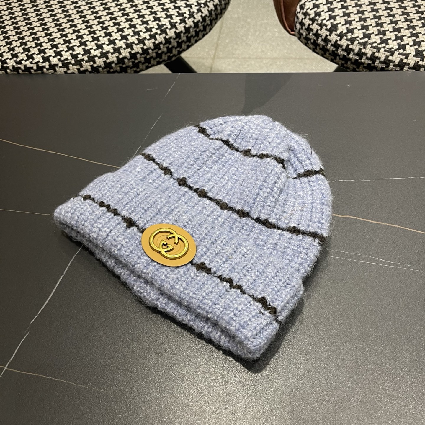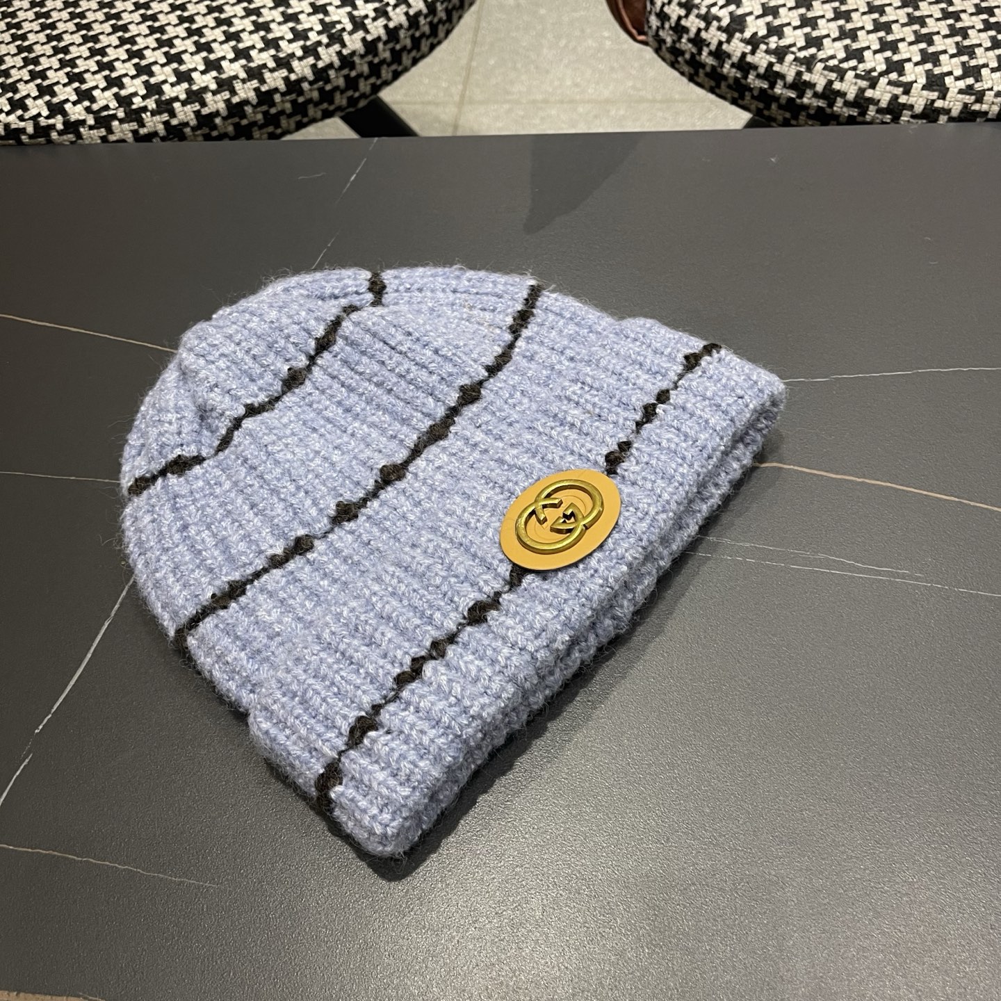p75 古奇GUCCI 新款条纹圆标针织毛线帽女秋冬保暖加大护耳百搭防风防寒包头帽潮