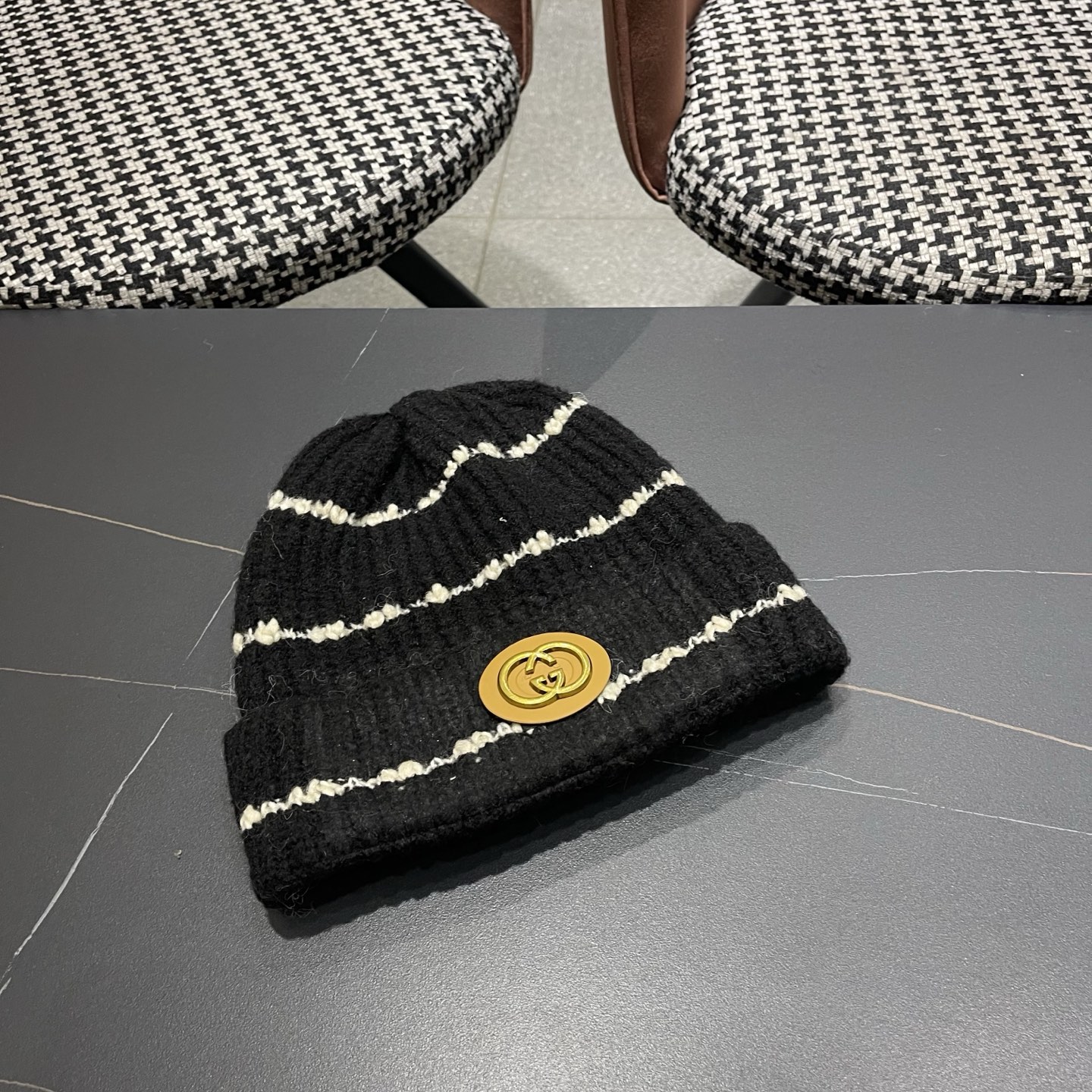 p75 古奇GUCCI 新款条纹圆标针织毛线帽女秋冬保暖加大护耳百搭防风防寒包头帽潮