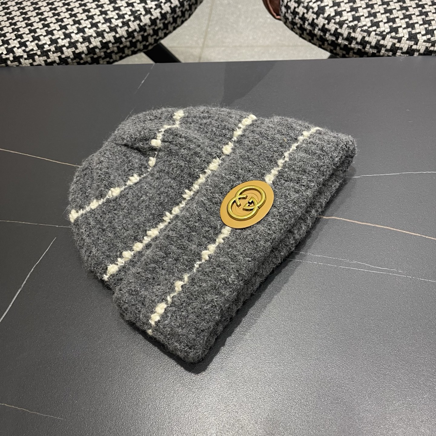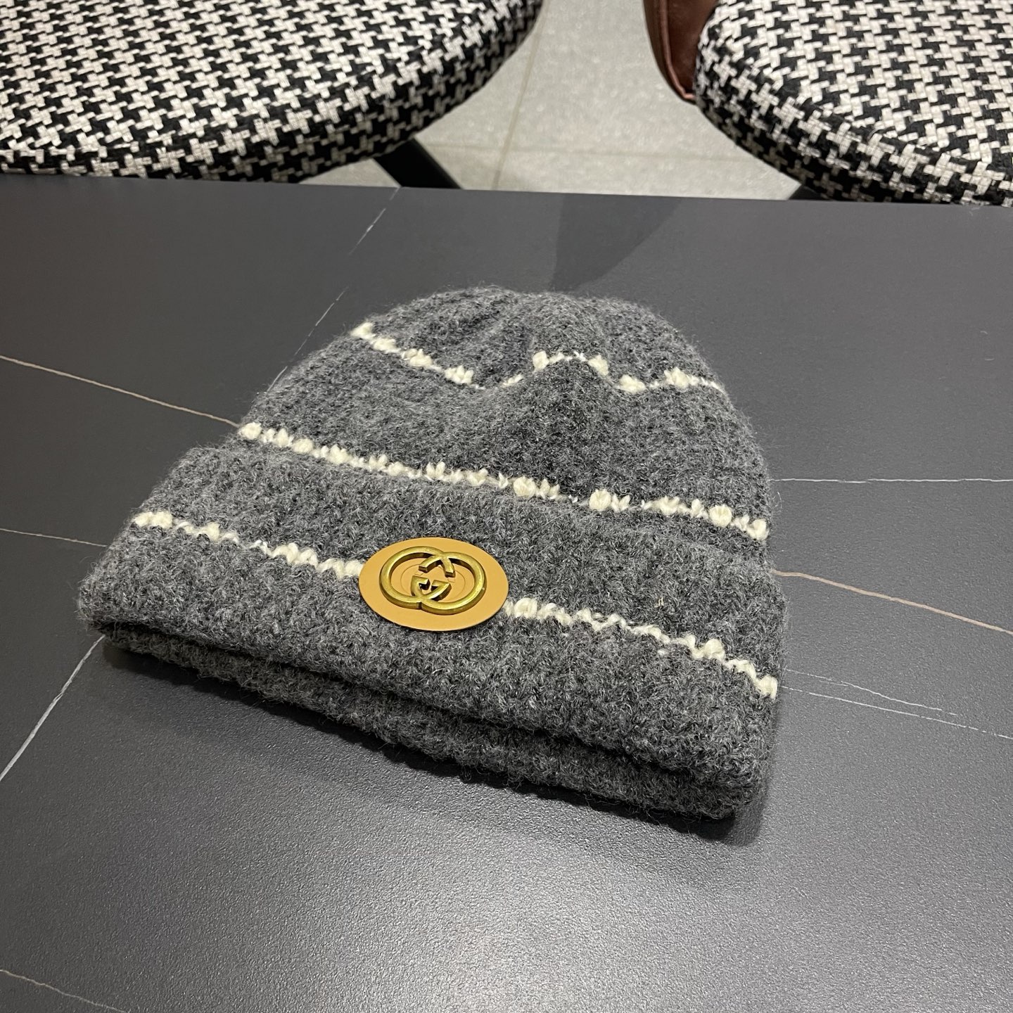 p75 古奇GUCCI 新款条纹圆标针织毛线帽女秋冬保暖加大护耳百搭防风防寒包头帽潮