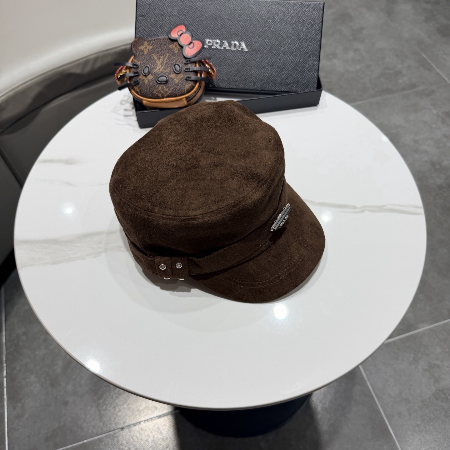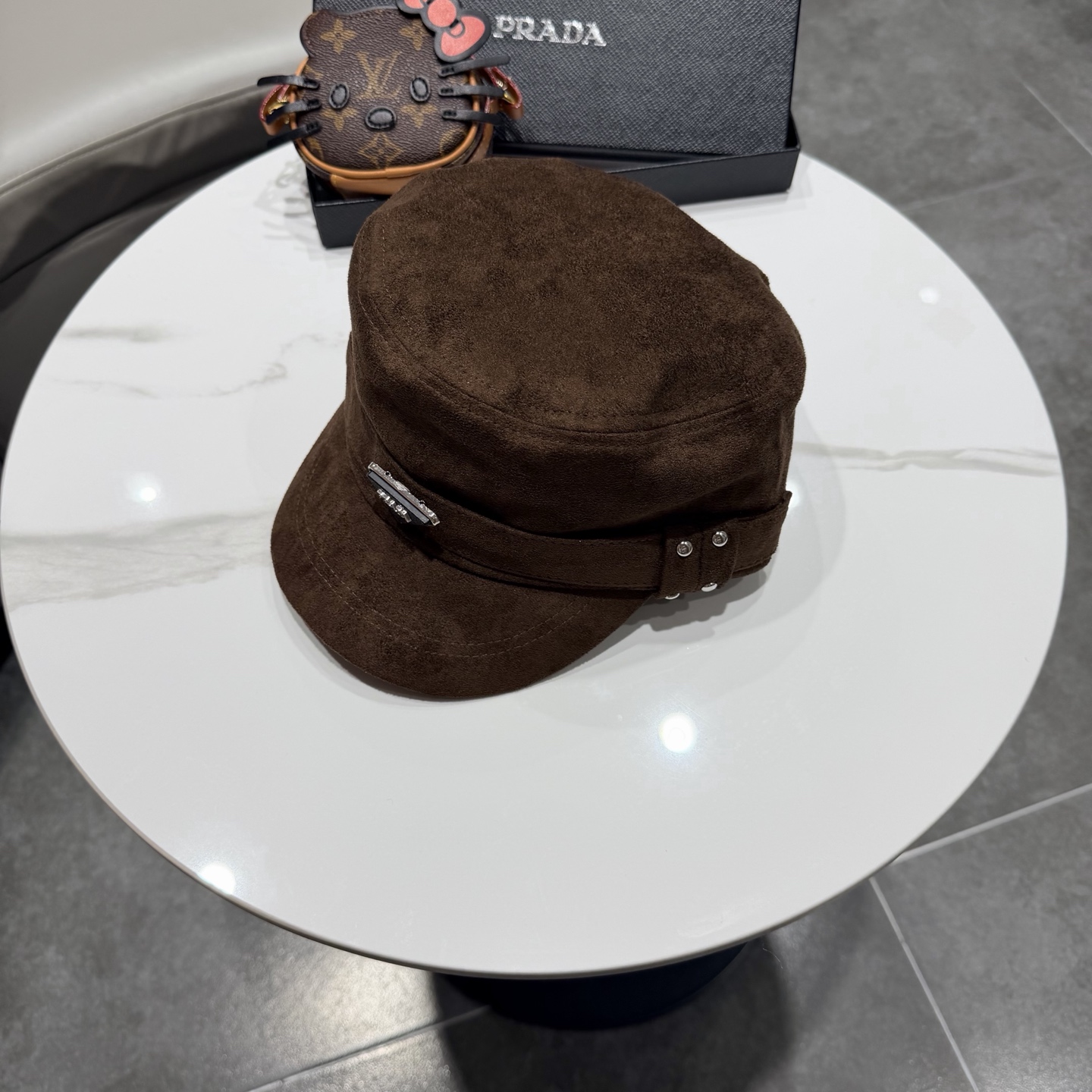P90普拉达prada铆钉复古皮绒平顶帽子女秋冬百搭青年气质骑车时髦防风马术帽