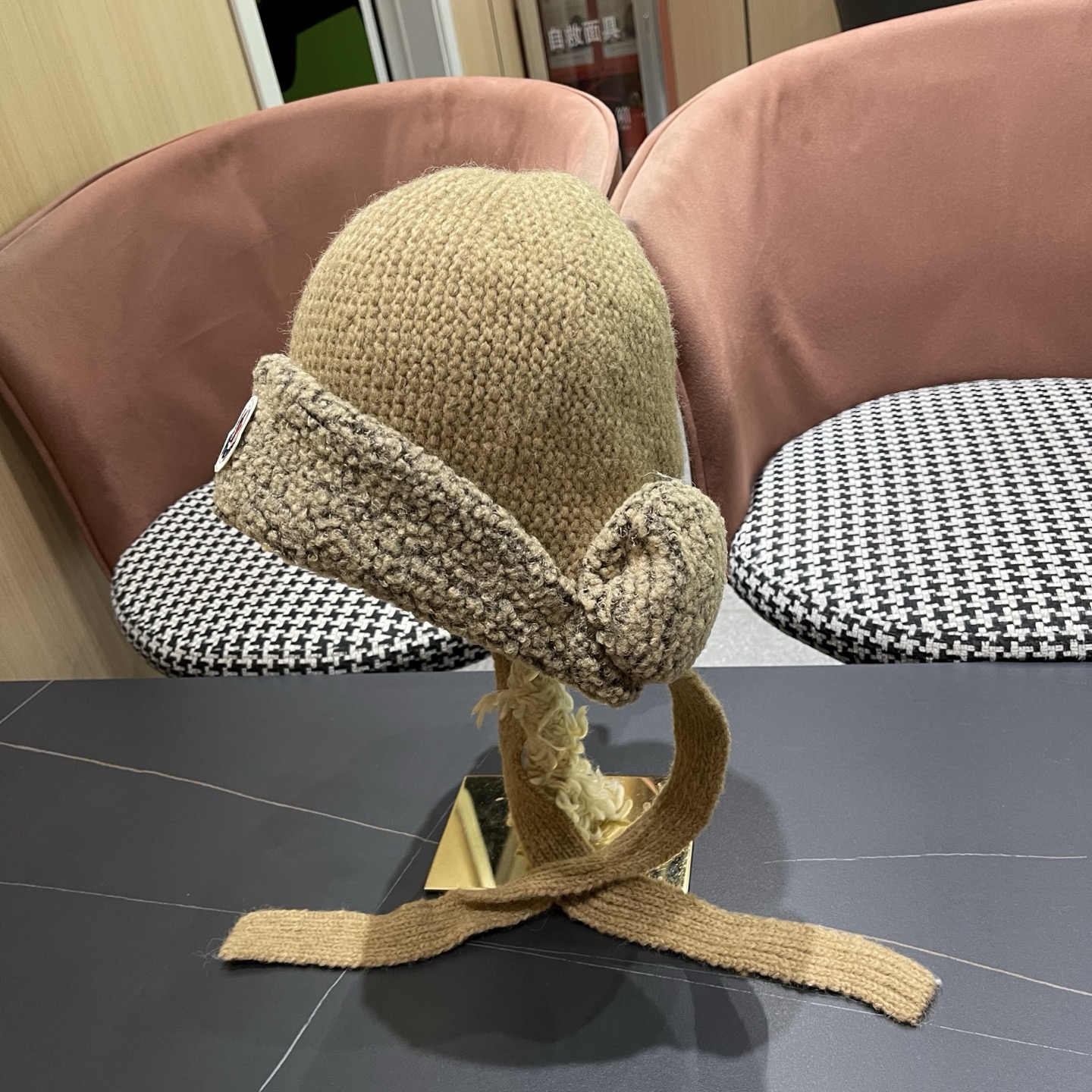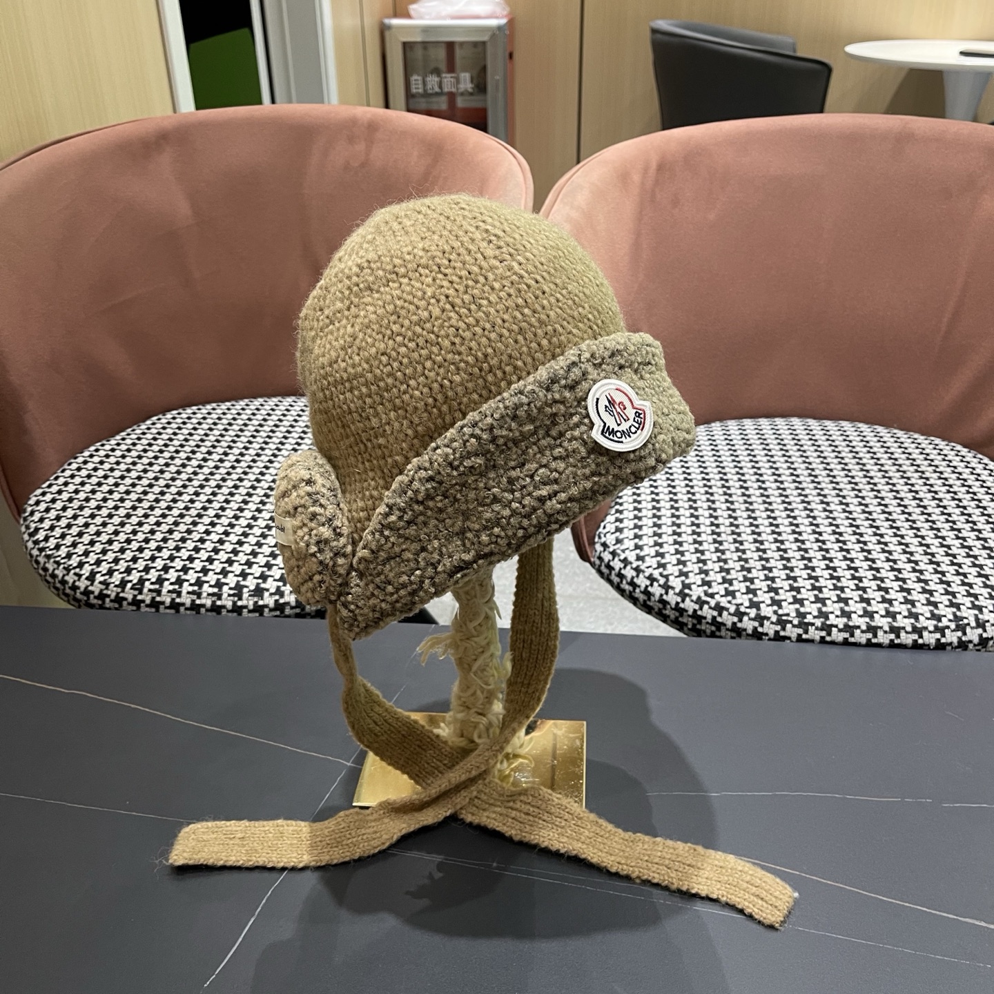p85 蒙口Moncler 韩版毛绒护耳帽子女秋冬绑带针织保暖耳机帽可爱显脸小雷锋帽防寒