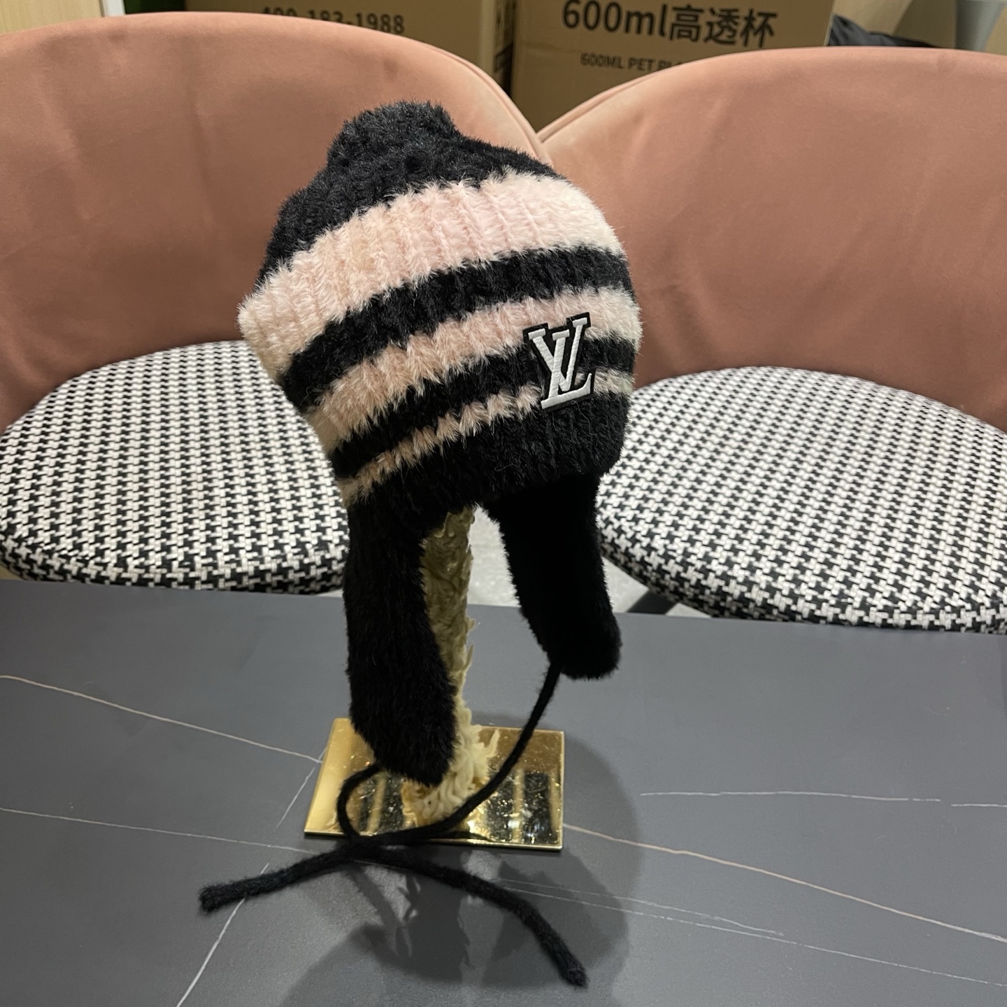 p80 Lv路易威登 日系复古条纹撞色护耳毛线帽女秋冬保暖学生百搭显脸小针织套头帽