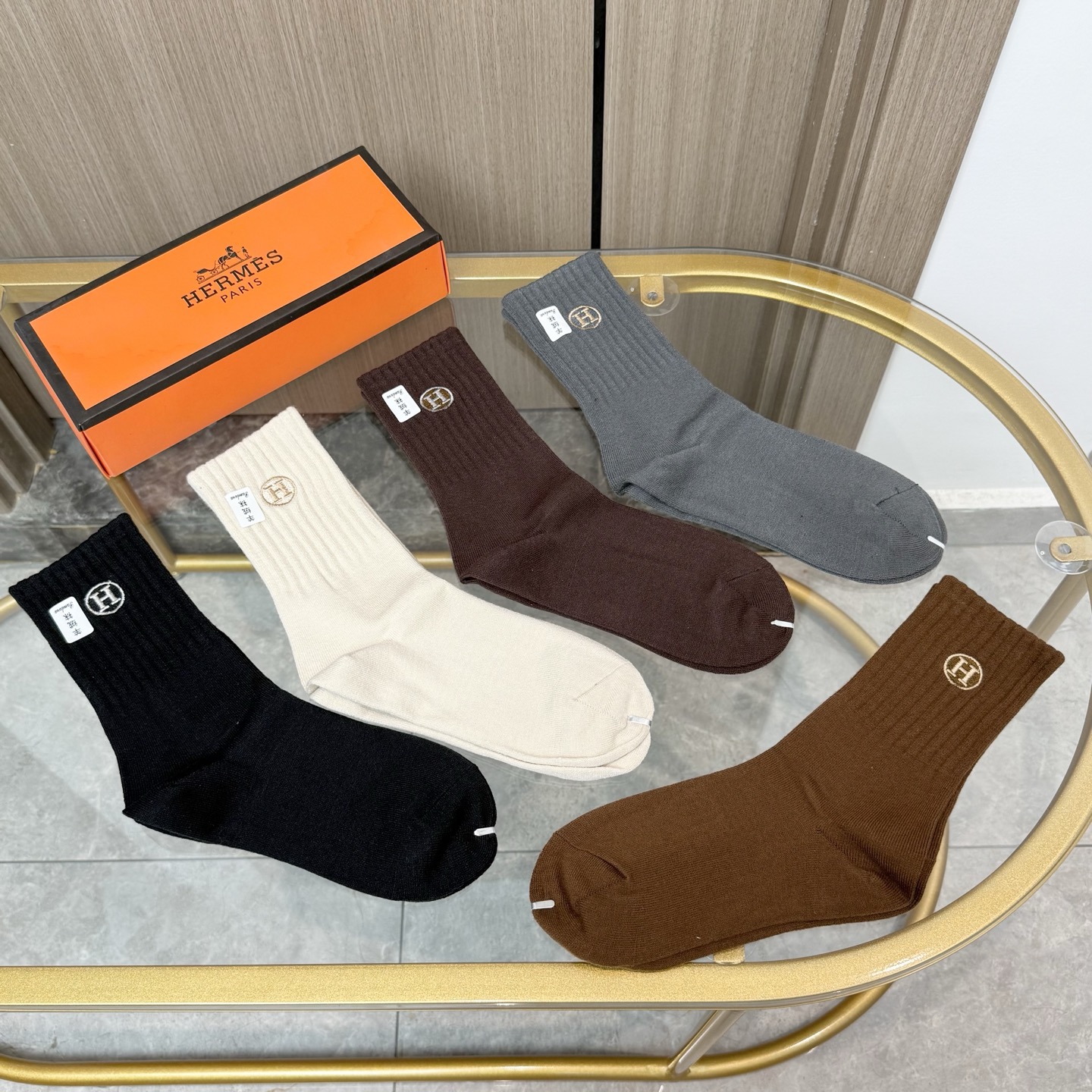 P60 配包装 【一盒五双】HERMER · 爱马仕经典中筒羊绒袜子❗️羊绒面料,专柜同步上新,袜身提花H品牌字母全称,罗口处刺绣H标志,特别吸睛,纯棉材质,上脚超柔软舒适,超火爆小单品,大牌出街,潮人必备🔥超好搭❗️