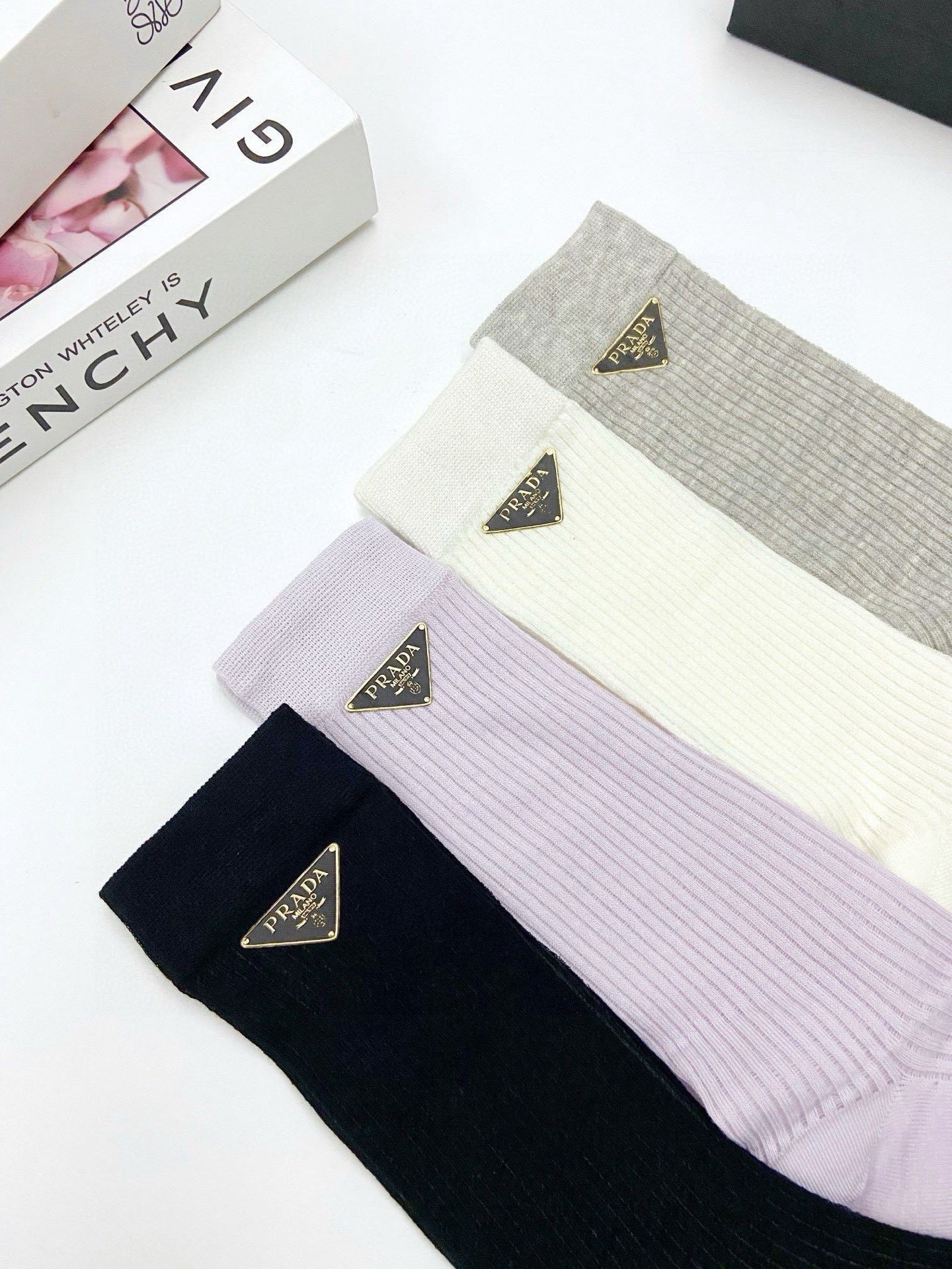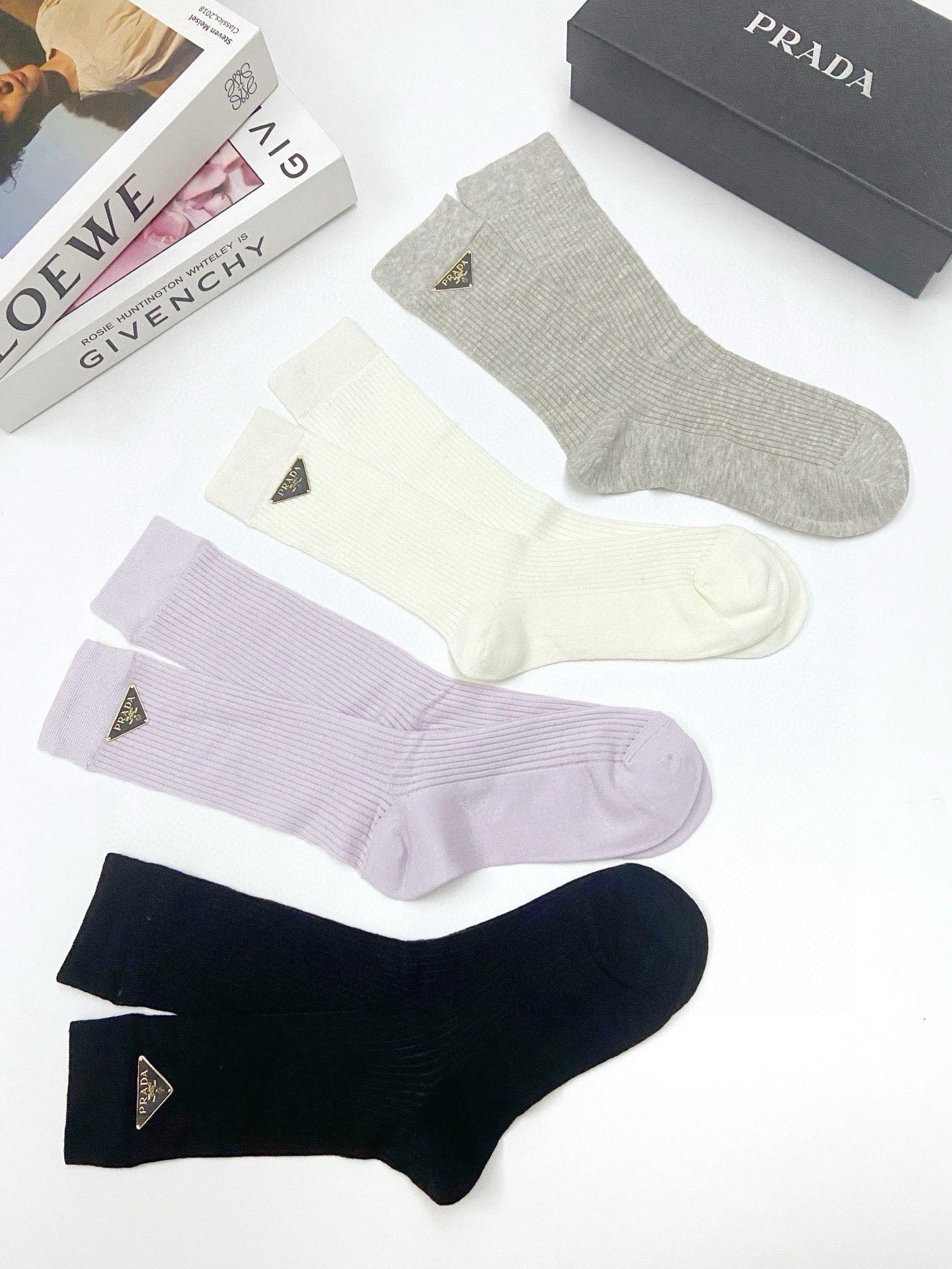 P60 配包装 🌟【一盒4 双】 🌟Prada 普拉达 经典字母logo 超薄无骨中筒袜,纯棉 条纹小腿袜 堆堆袜 🌟ins爆款!专柜在售ing 🌟原单货!高版本 ~好看到爆炸 !🌟酷妹潮人必不能少的专柜代购品质 袜子 ,搭配起来超高逼格 时髦度爆表啊啊啊啊~~推荐推荐推荐~~必入时髦小单品!!