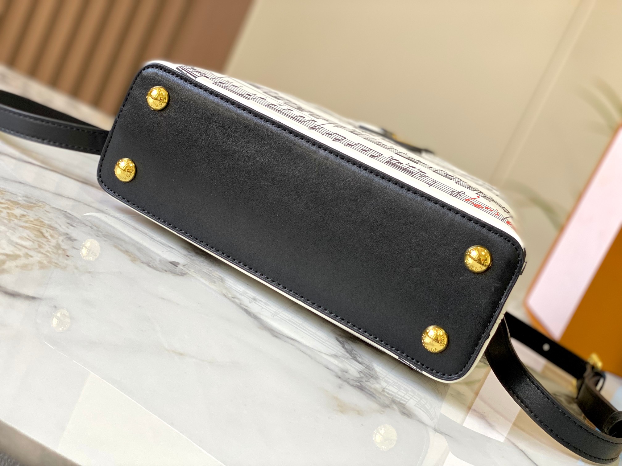 p370 广州货M20194白色配黑音符🎵 本款Capucines 中号手袋 法国进口小牛皮,闪亮的金属饰件,特有的Capucines搭盖既可收入包内展示字母标识,又可外翻 呈现Monogram Flower图案 size:27 x 18 x 9 厘米