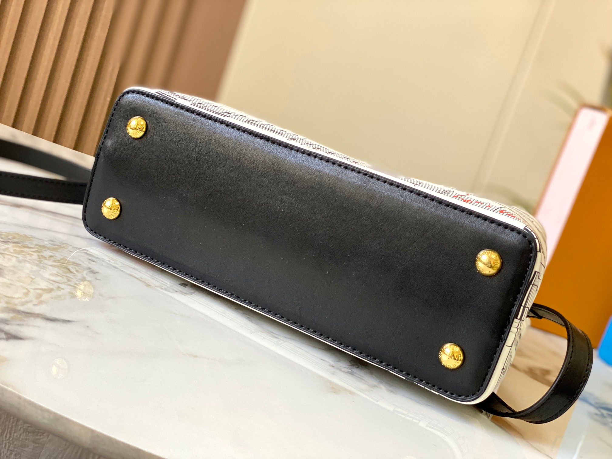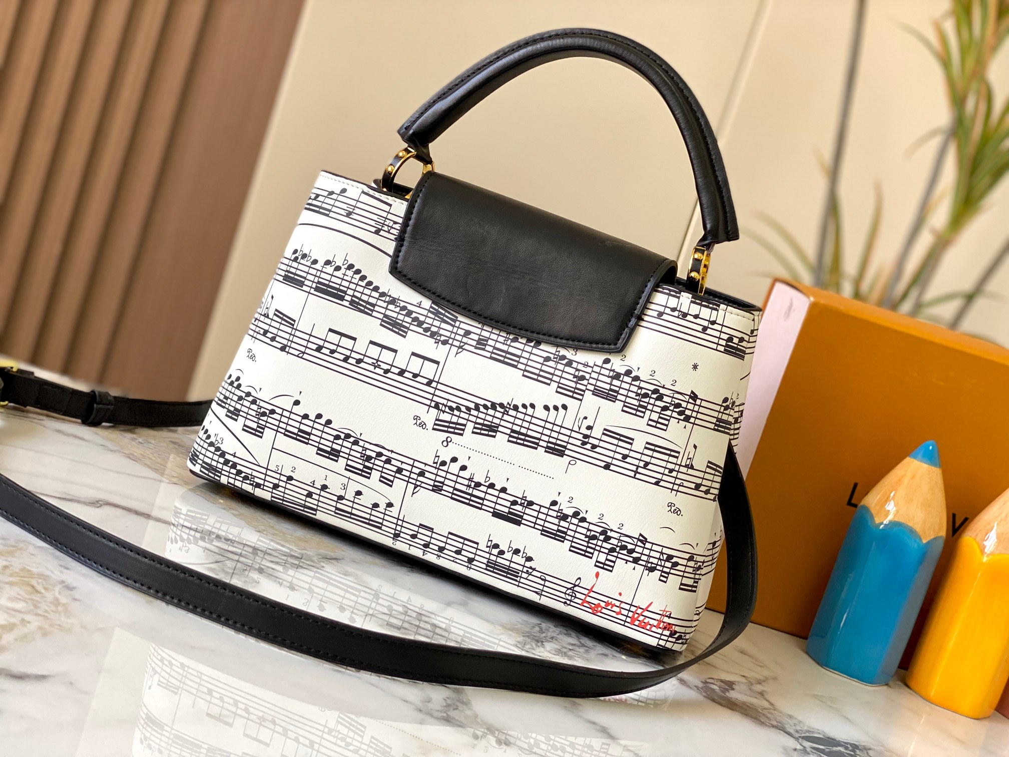 p380 广州货M20195白色配黑音符🎵 本款Capucines 大号手袋 法国进口小牛皮,闪亮的金属饰件,特有的Capucines搭盖既可收入包内展示字母标识,又可外翻 呈现Monogram Flower图案 size:31.5 x 20 x 11 厘米