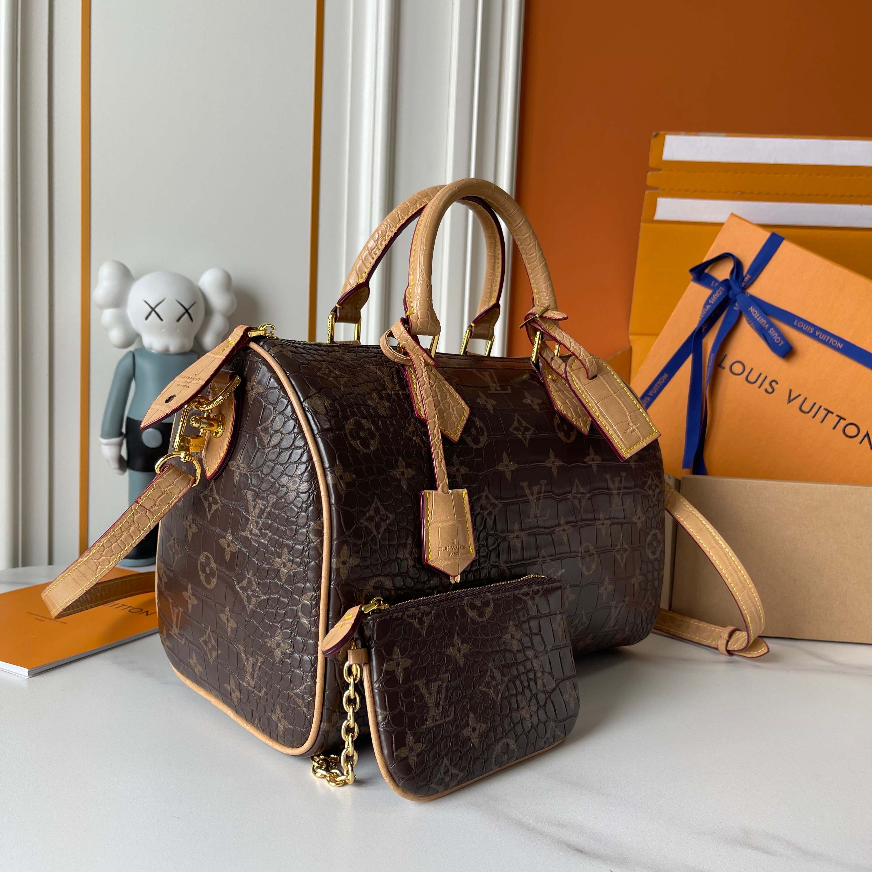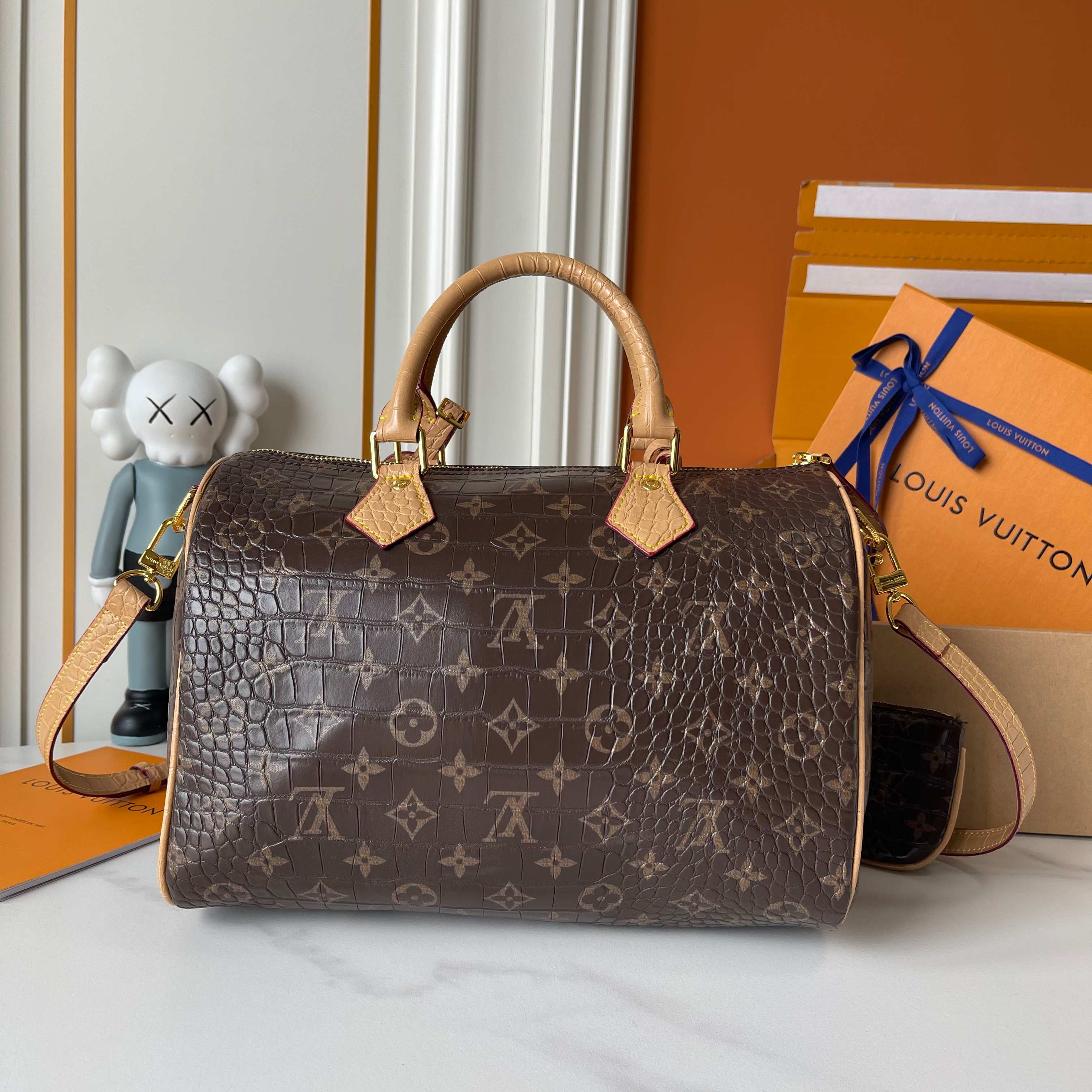 p300 【官方P159 鳄鱼皮】M17281 17282鳄鱼皮面料 M26305 M15279 M15278 M24441 M24424 M40390 M40391本款 Speedy Bandoulière 30 Monogram Leather 手袋选用柔软牛皮革,以 Monogram 图案重现帆布印花的考究观感。耀目金属件、羊皮革内衬和铭牌共同印证创意总监 Pharrell Williams 对细节的不懈追求。30 x 21 x 17 厘米(长度 x 高 x 宽)
