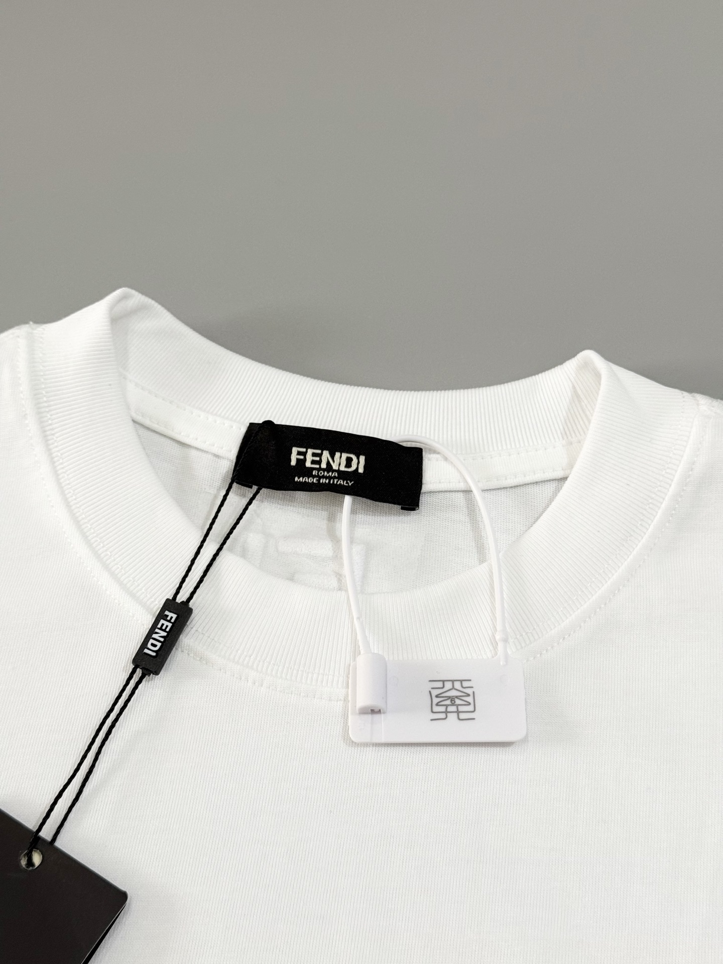 *胸部饰有撞色混合图案绣饰,图案中运用多种针法及设计,精美的刺绣和复杂的手工艺,精细的细节处理,造就了微感立体浮雕的刺绣效果。衣领背面饰有同色F标志绣饰。