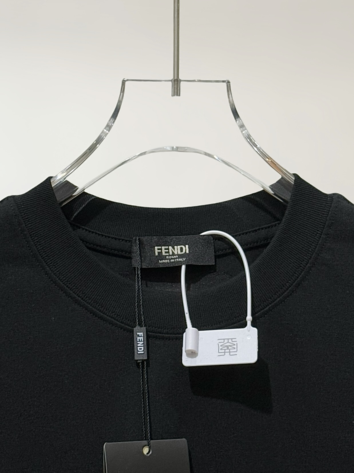 *胸部饰有撞色混合图案绣饰,图案中运用多种针法及设计,精美的刺绣和复杂的手工艺,精细的细节处理,造就了微感立体浮雕的刺绣效果。衣领背面饰有同色F标志绣饰。