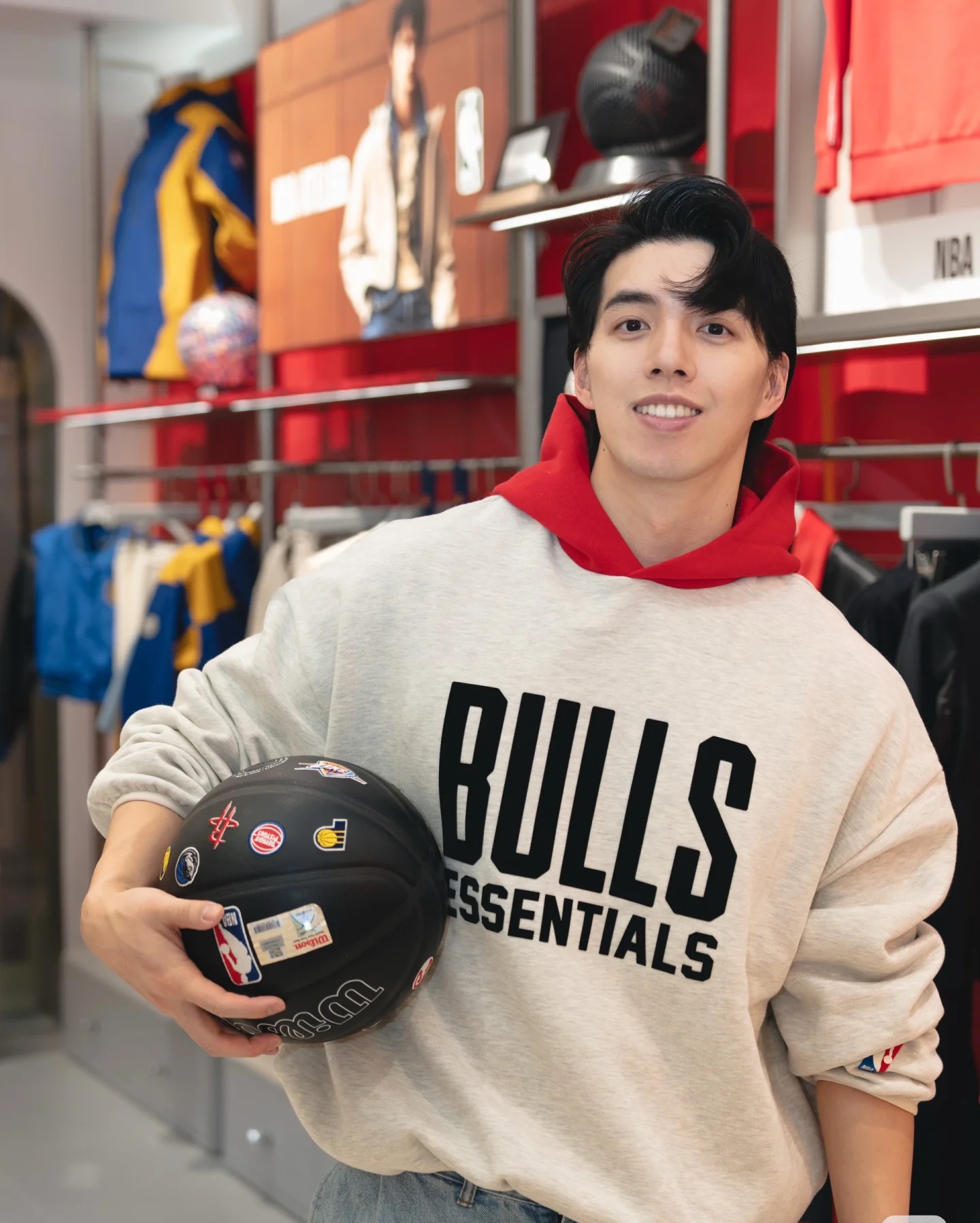 P173 💰Fear of God Essentials x NBA 联名款 SS25 NBA-allstar PULL OVER HOODIE - BULLS 芝加哥公牛队 美式重磅字母印花图案拼接连帽卫衣 男女同款 灰色拼红色 黑色、灰色 :S-XL