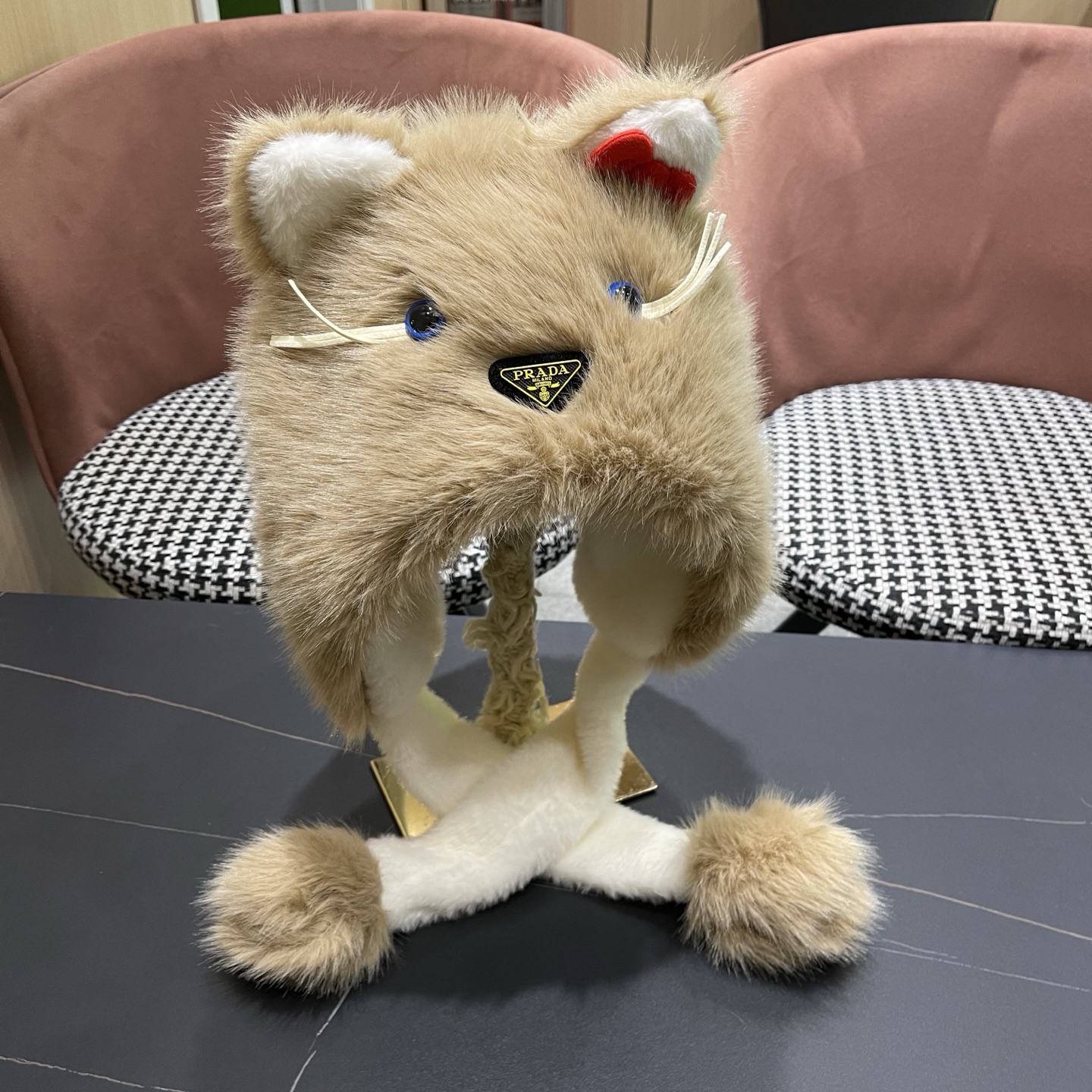 P125 普拉达PRADA可爱猫咪蝴蝶结毛绒帽子女冬季耳朵会动加 绒加厚保暖包头帽雷锋帽