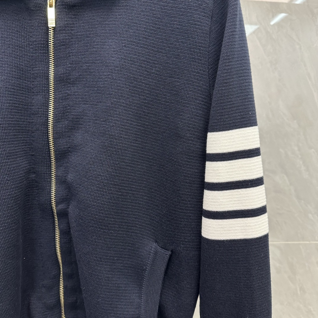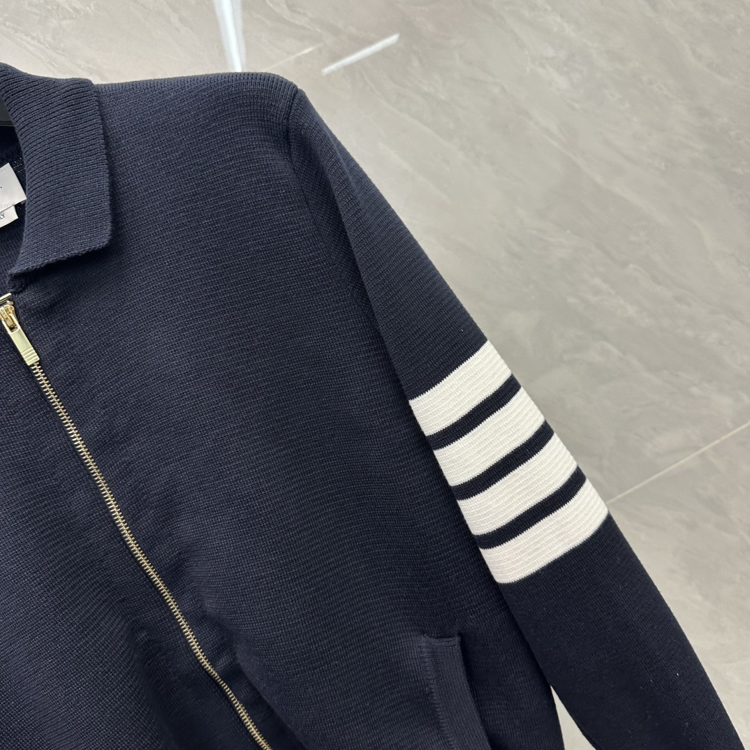 💰280 THOM BROWNE四杠翻领拉链针织衫 料子采用羊毛混纺 拉链采用TB四道杠拉链头 柔软舒适 生产采用日本进口自动针织机织造 针路紧密 袖子条纹针织而成 版型可修身可宽松 舒适透气 男女同款 三标齐 包装吊牌齐全 可加全套礼盒包装 颜色:灰色/藏青 尺码:1/2/3/4