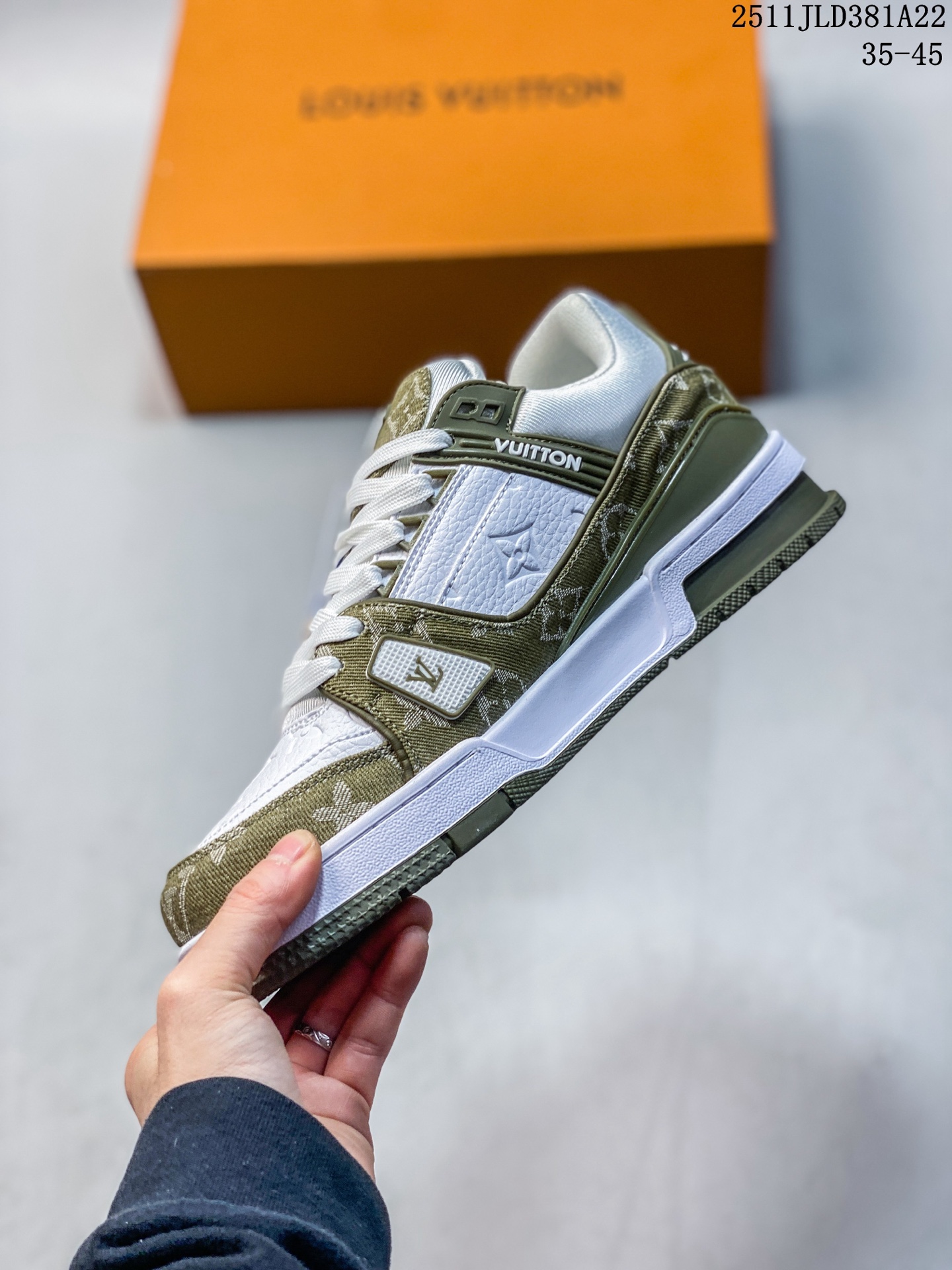 💰200 【公司级】路易威登 Louis Vuitton LV路易威登板鞋 时尚运动鞋潮厚底增高男女鞋。舒适防滑底和百搭性霸屏整个时尚娱乐圈,细节调整完美主义!采用柔软皮革拼接鞋面,独家开模大底, 侧边采用3D打印标志性Logo 尽显贵族时尚气息,配带正品全套包装。全新LV路易威登Louis vuitton Trainer Sneaker Low 休闲运动文化百搭板鞋。 11JLD381A22
