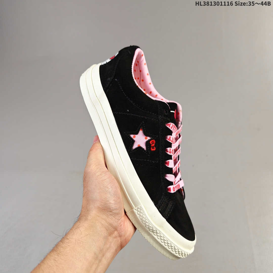集合💰130 男女鞋真标硫化工艺#双层围条夹布防开胶工艺#OrthoLite欧索莱缓冲环保去臭鞋垫组合聚氨酯硅蓝PU减震❗萌到犯规,携手日本知名卡通 IP凯蒂猫《Hello Kitty》 x Converse One Star Suede Low"Prism Pink"一星古着系列经典低帮复古休闲百搭硫化板鞋“联名浅粉红凯蒂猫”362941C 尺码:35 36 36.5 37 37.5 38 39 39.5 40 41 41.5 42 42.5 43 44 主要以 Hello Kitty 形象搭配标志性粉色,鞋头处的小蝴蝶结、星星两侧的猫胡须这样的小细节更是可爱到犯规。Hello Kitty不注视你,反而像猫星人般好奇的凝望着街头上的人。HL381301116 Size:35~44B