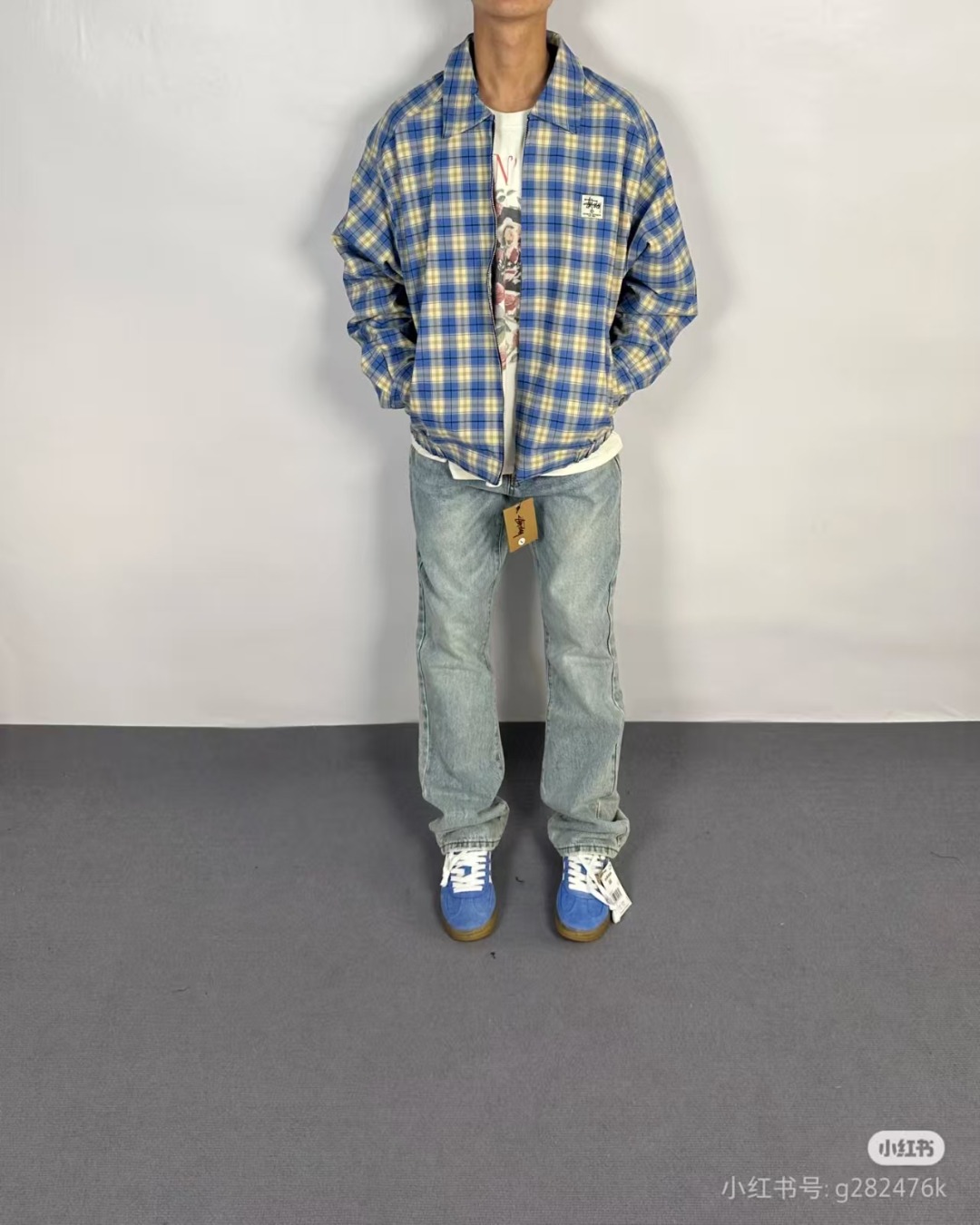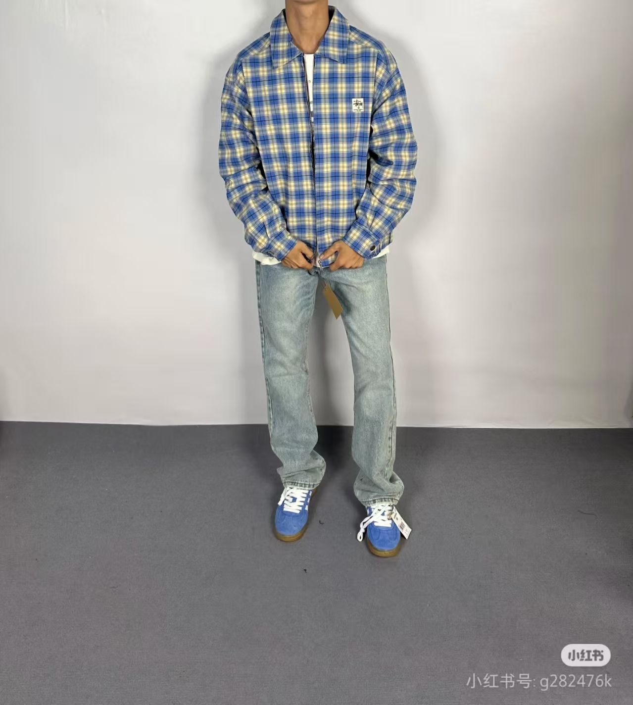 模特上身效果 Stussy 斯图西蓝色对格夹克外套