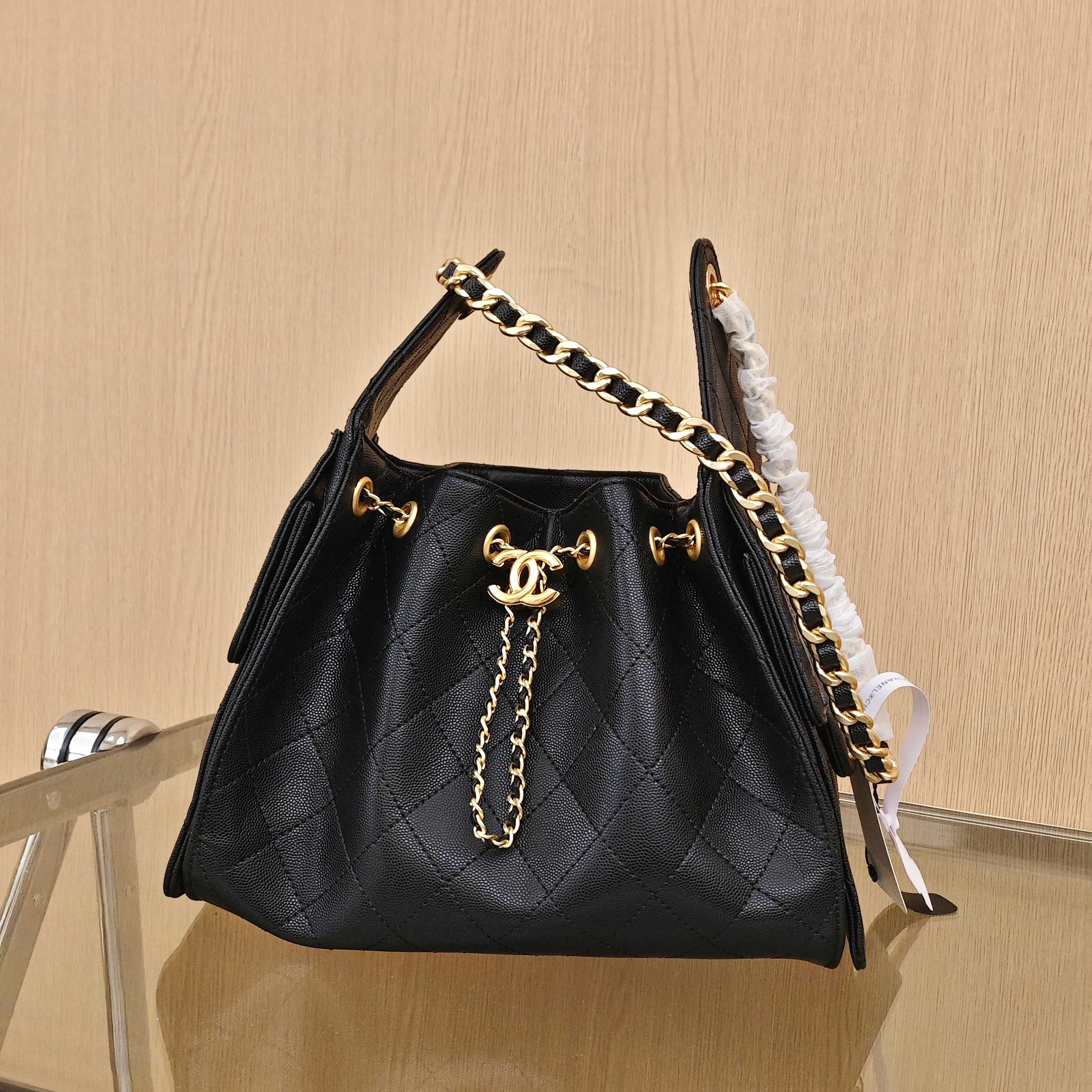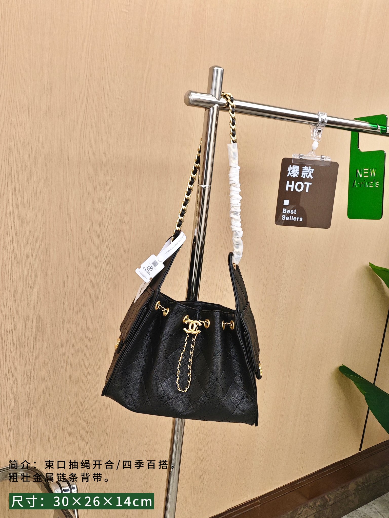 🛒香奈儿25bag购物袋 ¥360 尺寸:30×26×14cm 简介:束口抽绳式开合,四季百搭,内部空间宽敞,搭配粗壮金属链条背带,可手提/可腋下背。