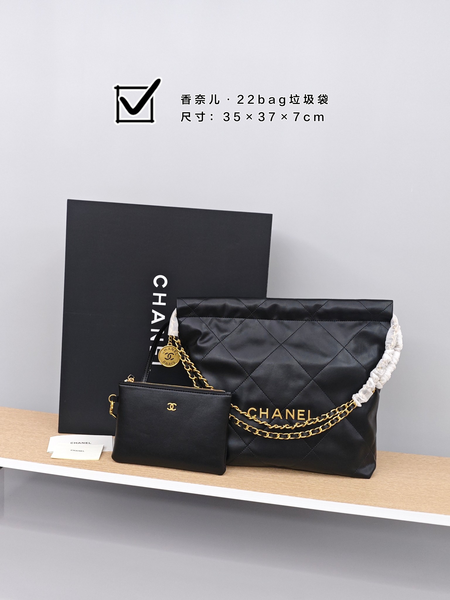 ✅香奈儿·22bag垃圾袋 💰300 尺寸:35×37×7cm 特点:风格随性慵懒,四季百搭。 简介:抽绳式吸磁开合,内置拉链口袋,内部空间宽敞,搭配小手包非常实用,黄金尺寸,可放下大屏iPad。