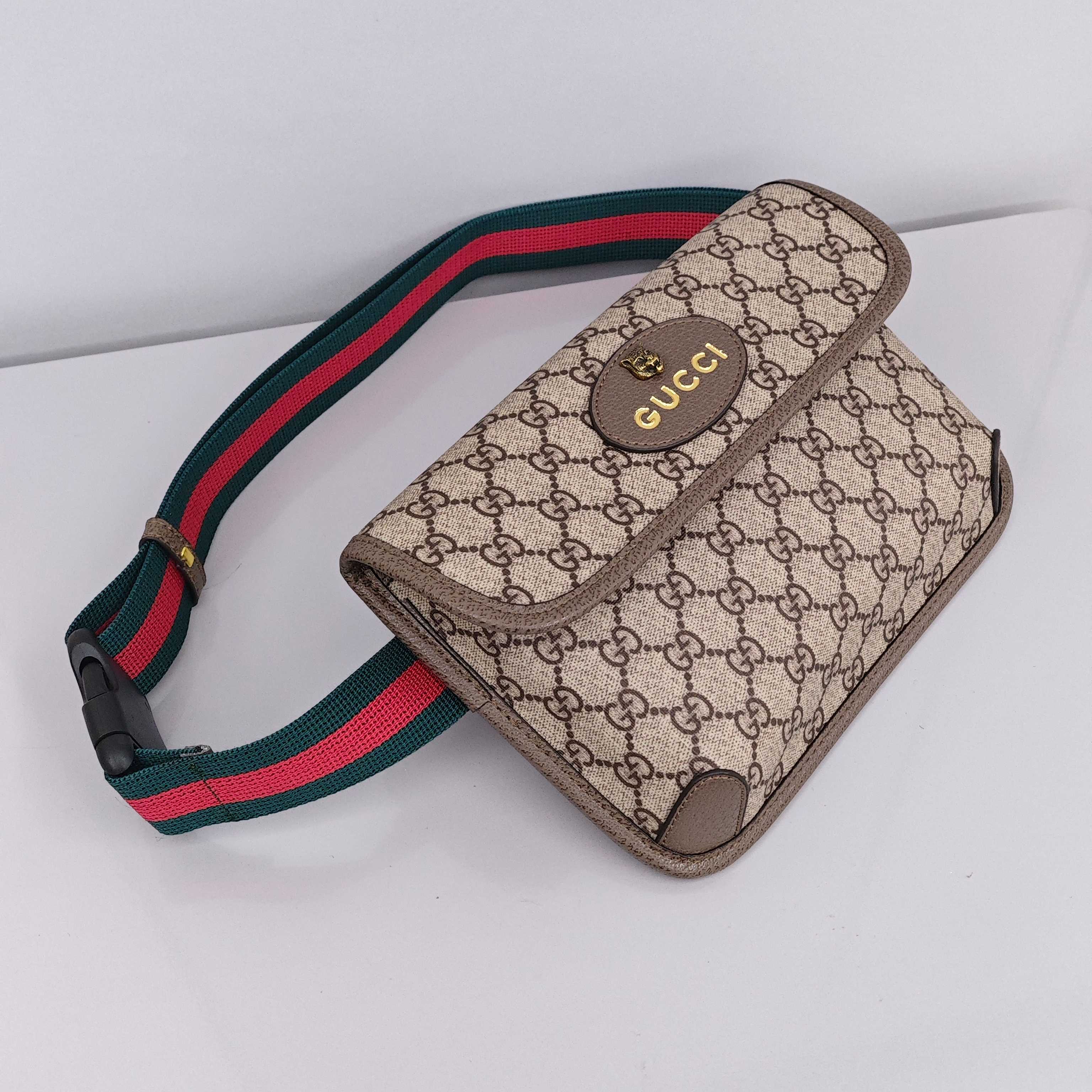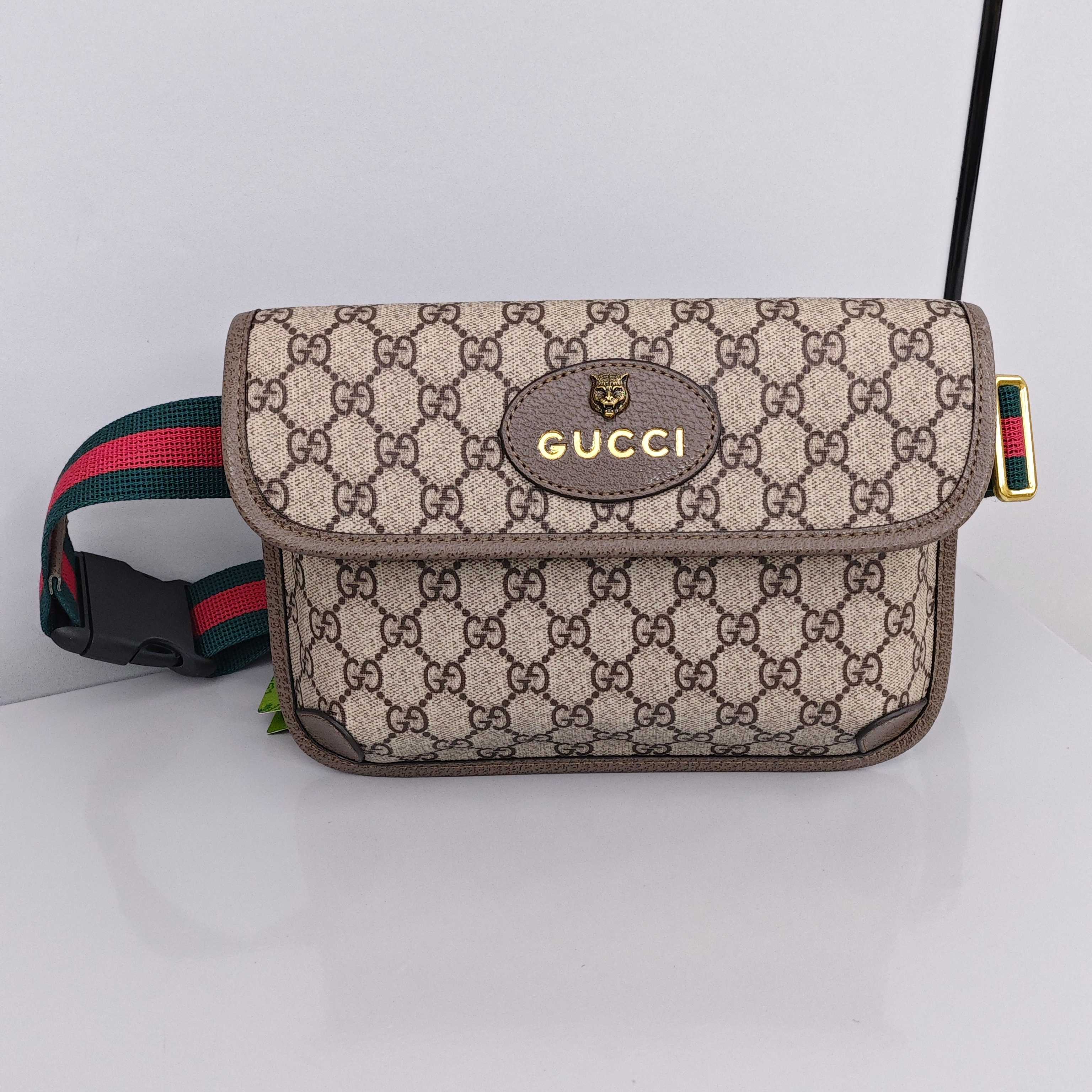 GUCCI虎头腰包💰190 尺寸:24×16×3.5cm 特点:经典双g印花,彰显时尚气息。 方式:吸磁翻盖开合,背带可调节长短,GG supreme帆布环保材质。