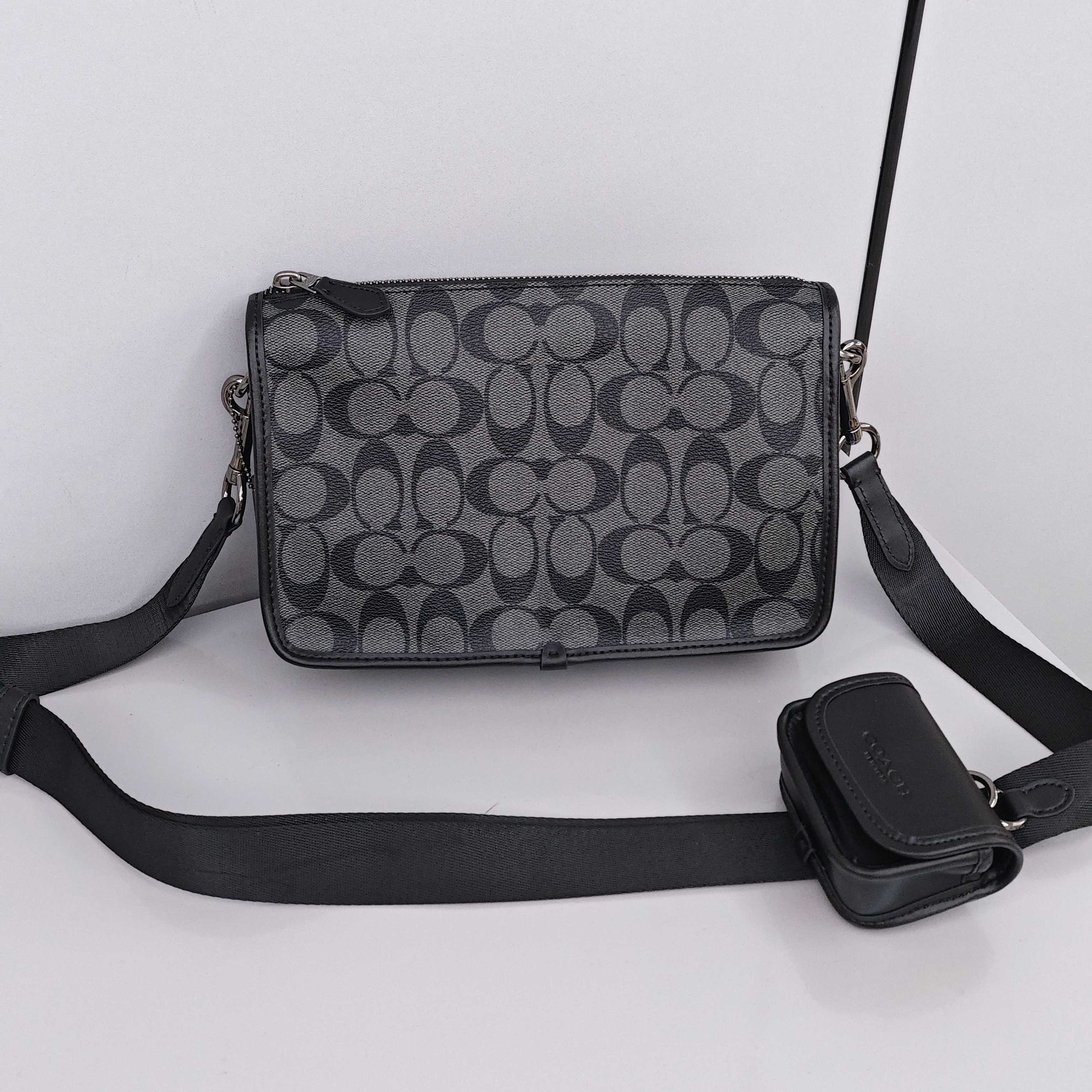 蔻驰二合一斜挎包💰260 尺寸:25×16×5cm 特点:标志性Signature印花,帅气十足。 方式:拉链式开合,配的小包才是灵魂,可以放置蓝牙耳机,肩带可拆卸,可手拿可斜挎背。