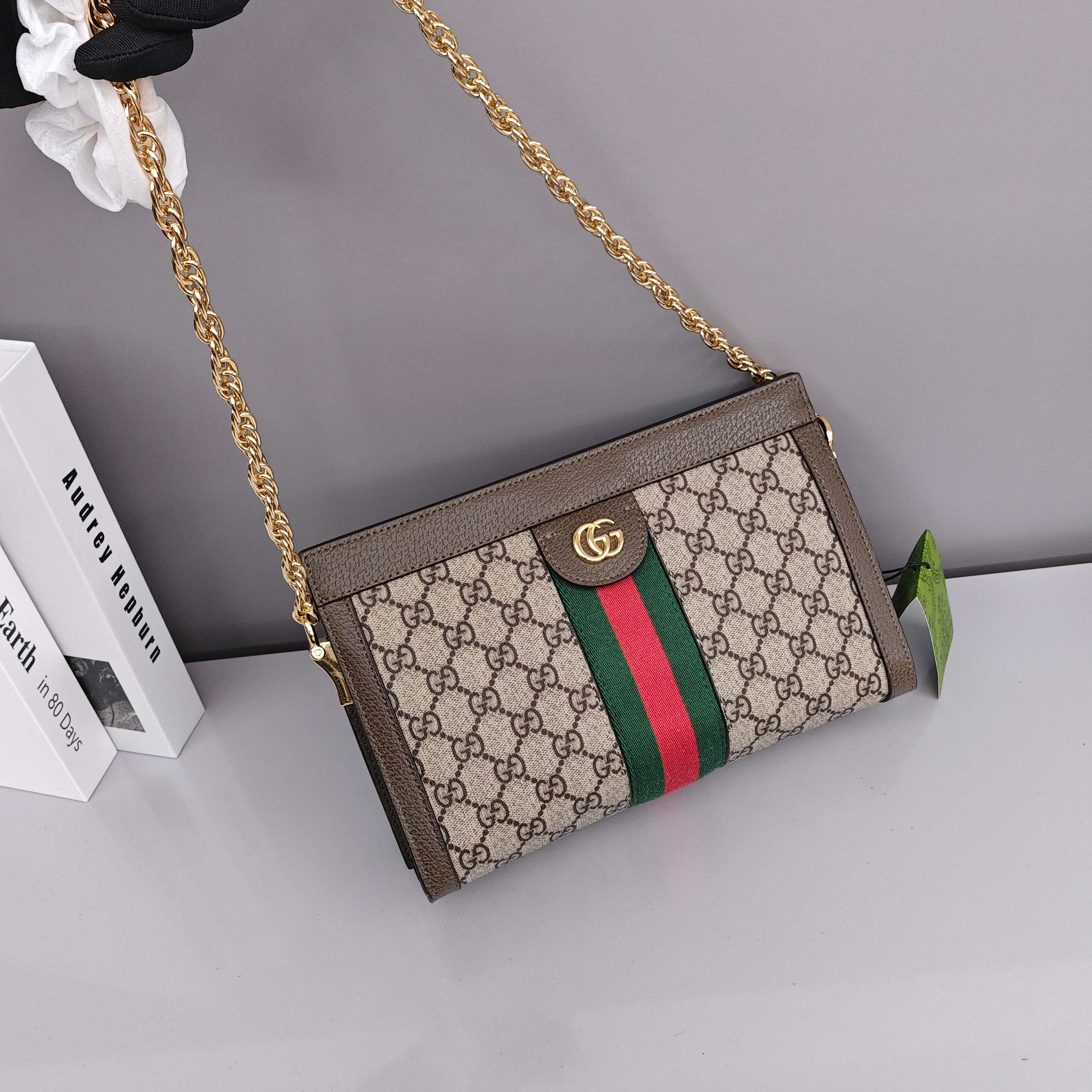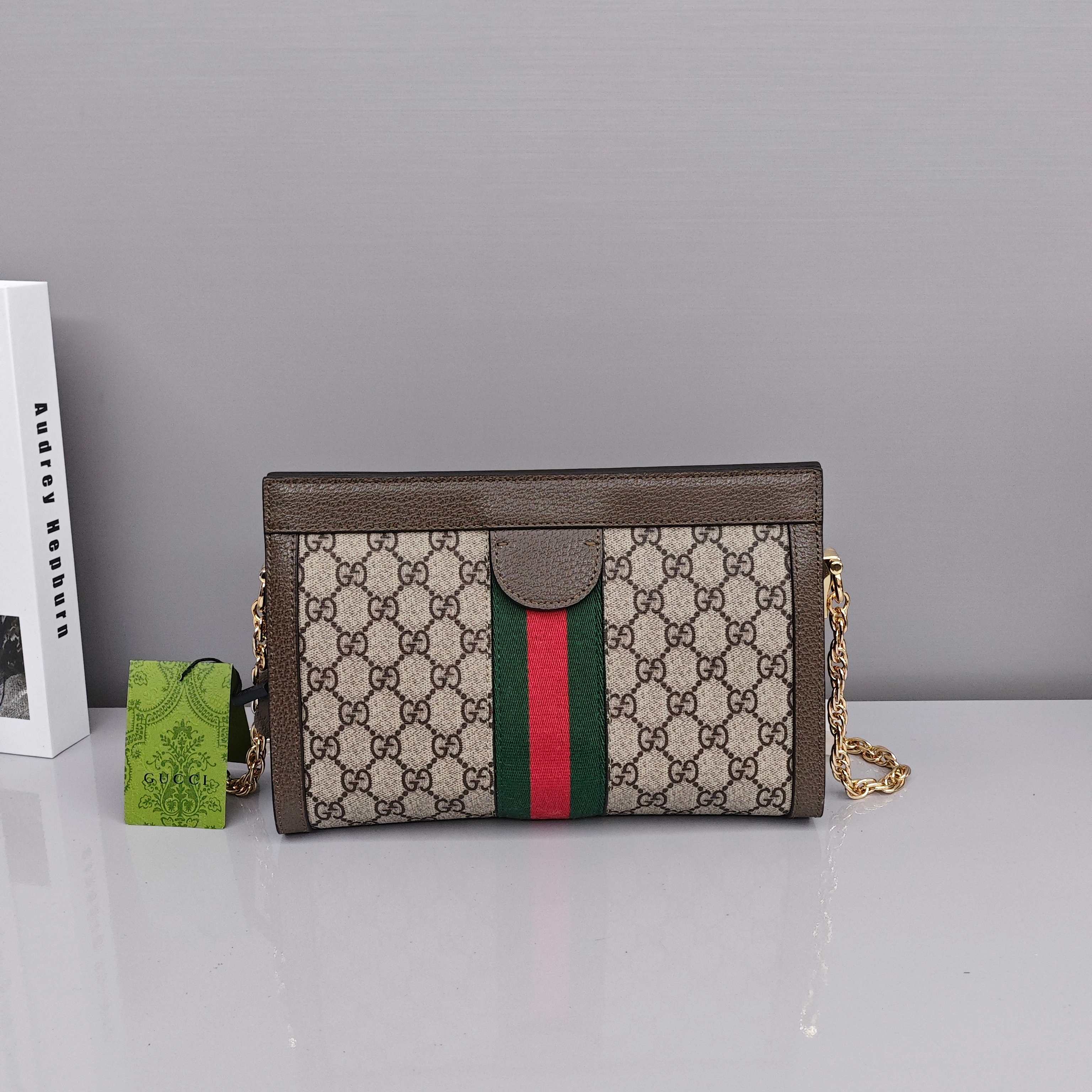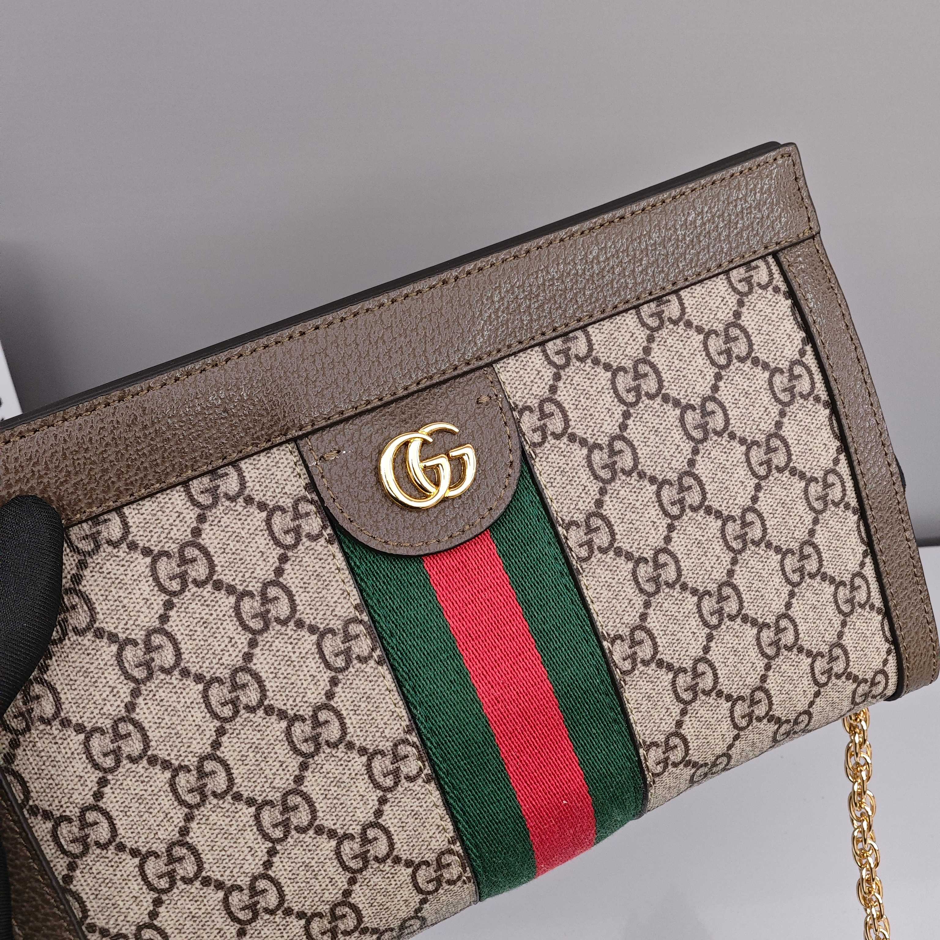 Gucci Ophidia链条包💰280 采用GGsupreme高级人造帆布,复古又经典,构造简约加上经典双G印花搭配,标志性条纹织带,原版五金链条,斜挎手拿随时转换,深受好评百搭。 尺寸:26×17.5×8cm