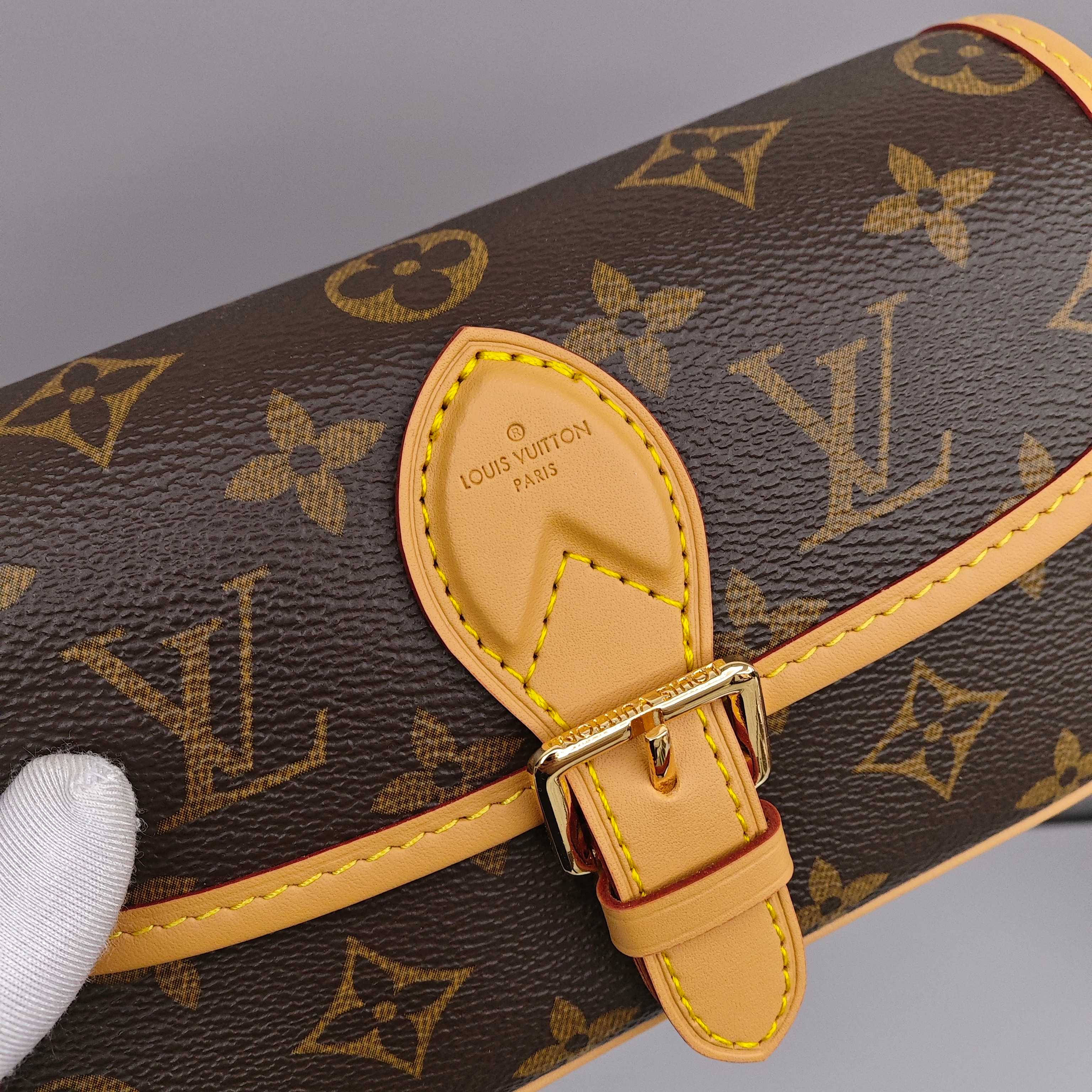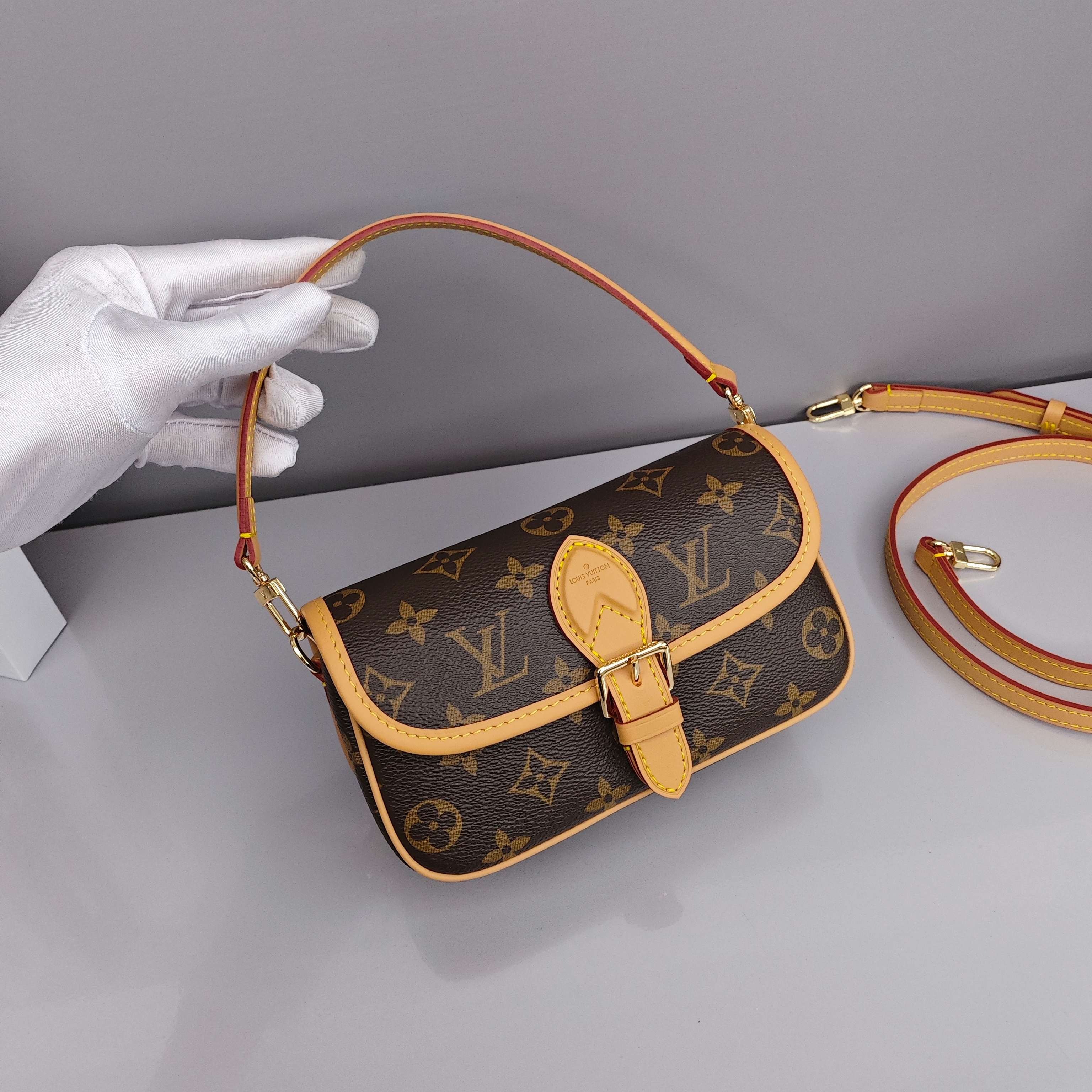 Lv nano迷你法棍包💰260 以Monogram Empreinte 皮革浓缩 Diane 手袋的经典构型,复现圆润翻盖和腰带式开合等原型细节,充裕空间可收纳手机和日常所需,可拆卸手柄和可拆卸并调节的肩带实现灵活背携,昼夜场合皆宜。 尺寸:19×10.5×6cm