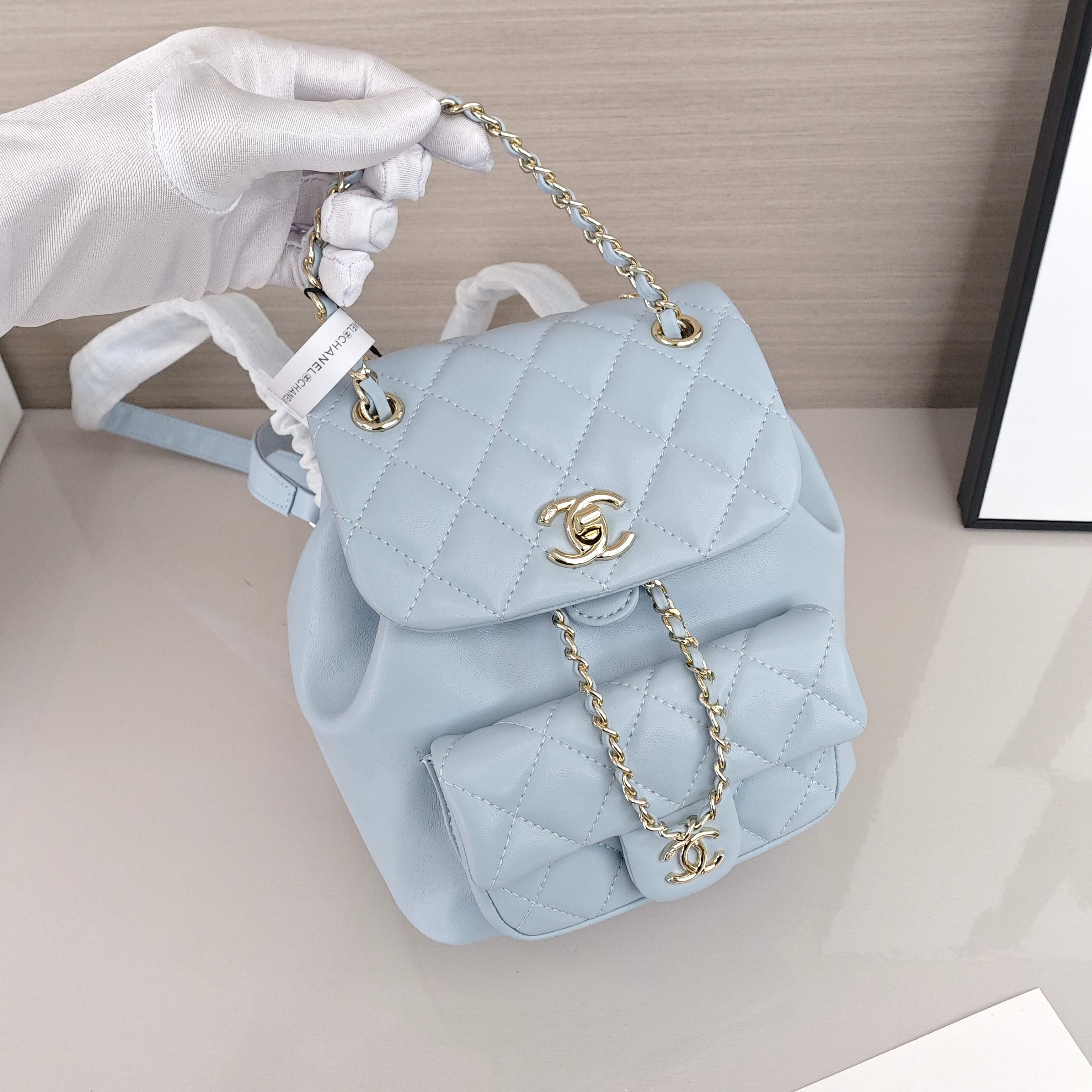 香奈儿Duma双肩包💰300 一款四季皆可百搭的双肩包,一眼种草,搭配香槟金五金,双肩带有调节孔可调节,独特的设计感和满分的实用性,日常通勤收纳轻松装扮,上身小巧可爱,不论双肩单肩手提都好看。 规格:22×21×18cm
