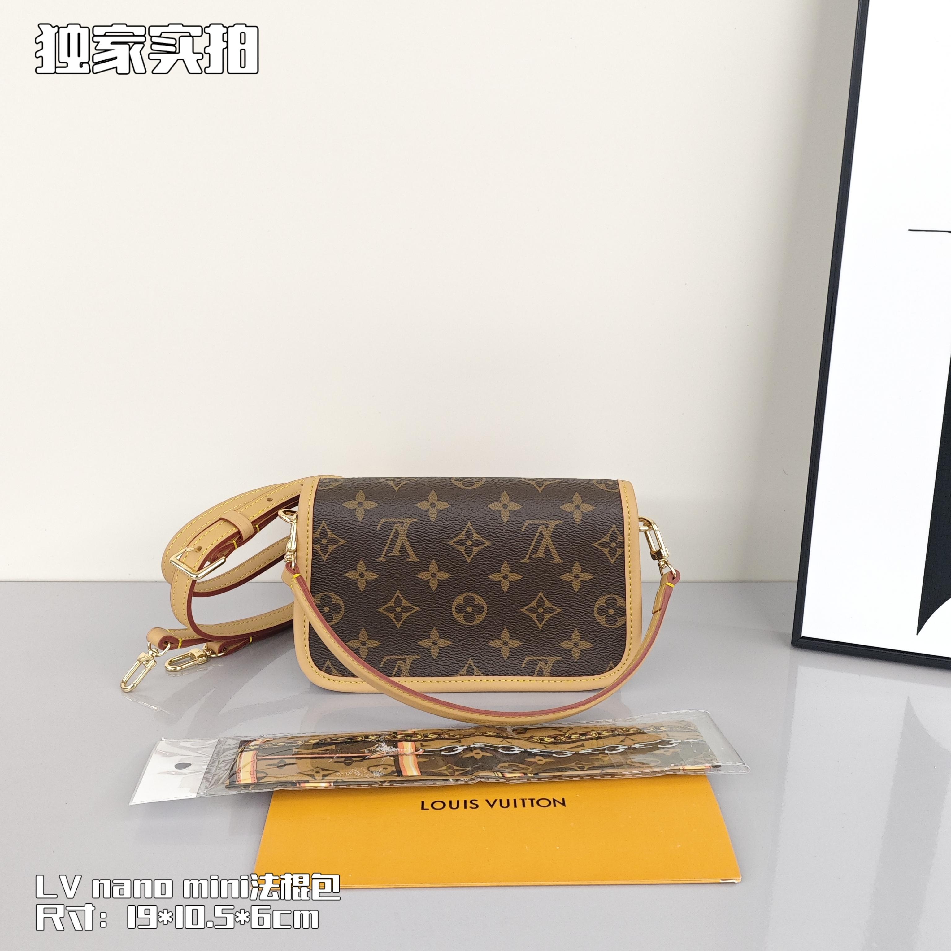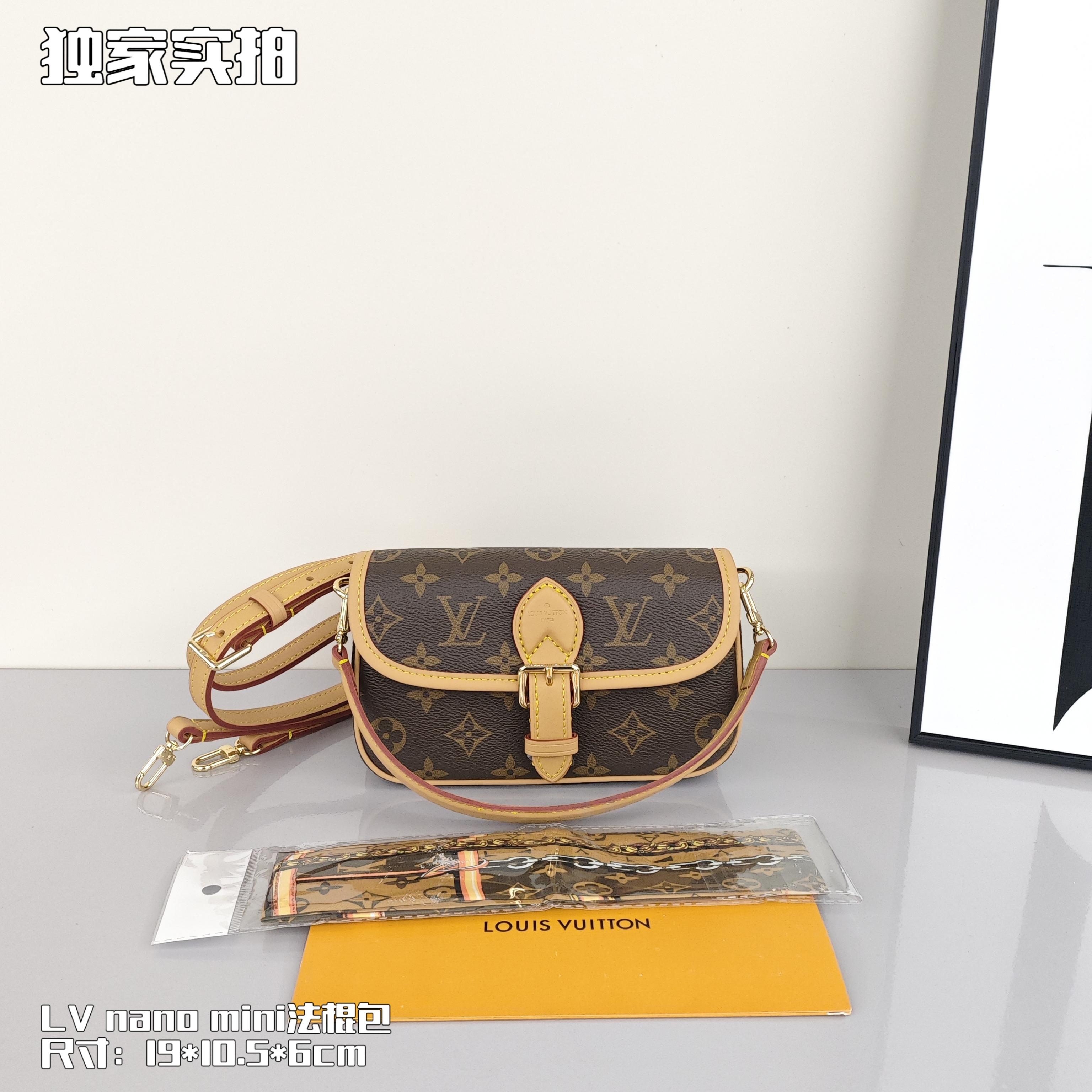 Lv nano迷你法棍包💰260 以Monogram Empreinte 皮革浓缩 Diane 手袋的经典构型,复现圆润翻盖和腰带式开合等原型细节,充裕空间可收纳手机和日常所需,可拆卸手柄和可拆卸并调节的肩带实现灵活背携,昼夜场合皆宜。 尺寸:19*10.5*6cm