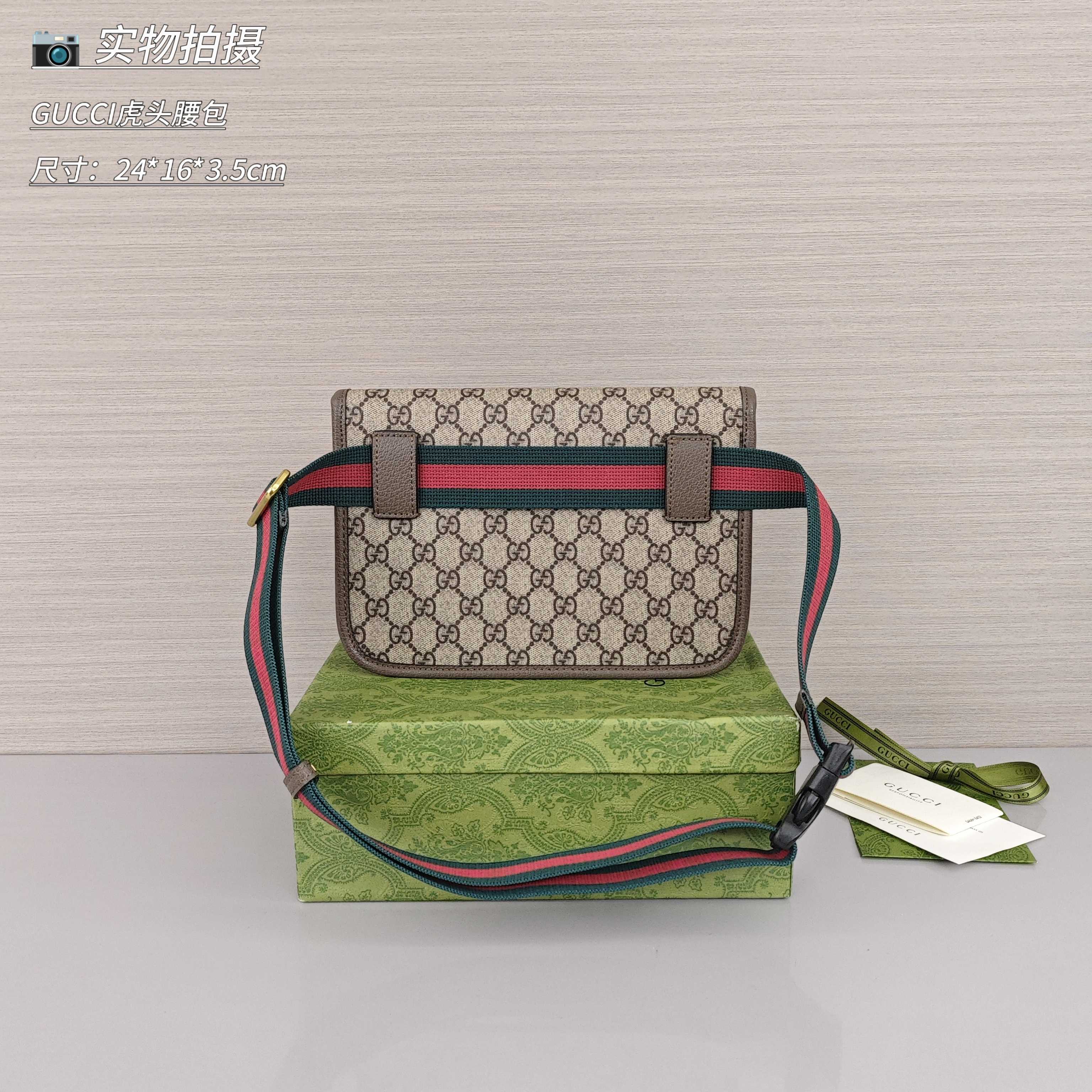 GUCCI虎头腰包💰190 复古风依然是今年的主旋律,正面饰以虎头,搭配经典红绿可调节肩带,时尚单品,胸包,腰包,挎包,多用性。 尺寸: 24*16*3.5cm