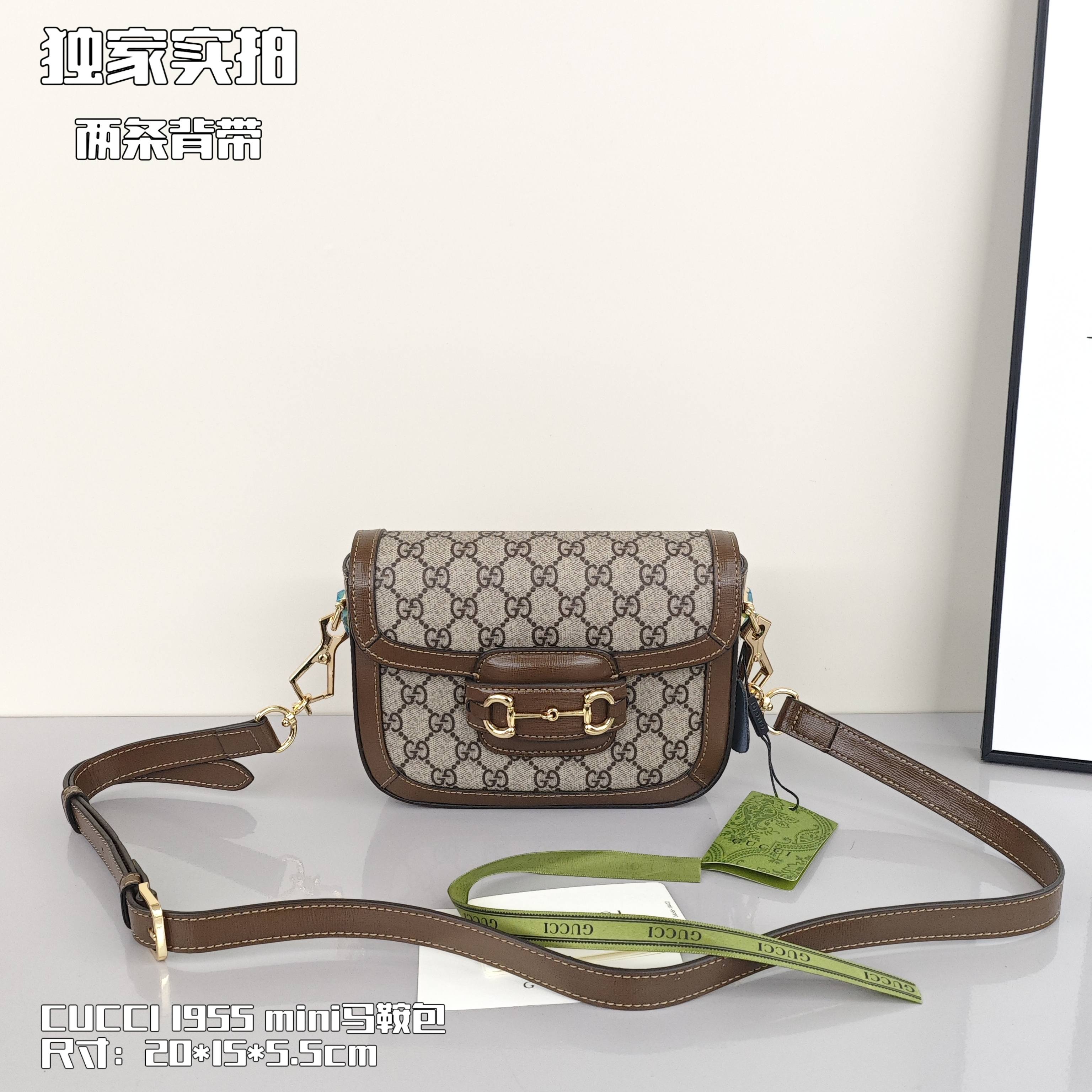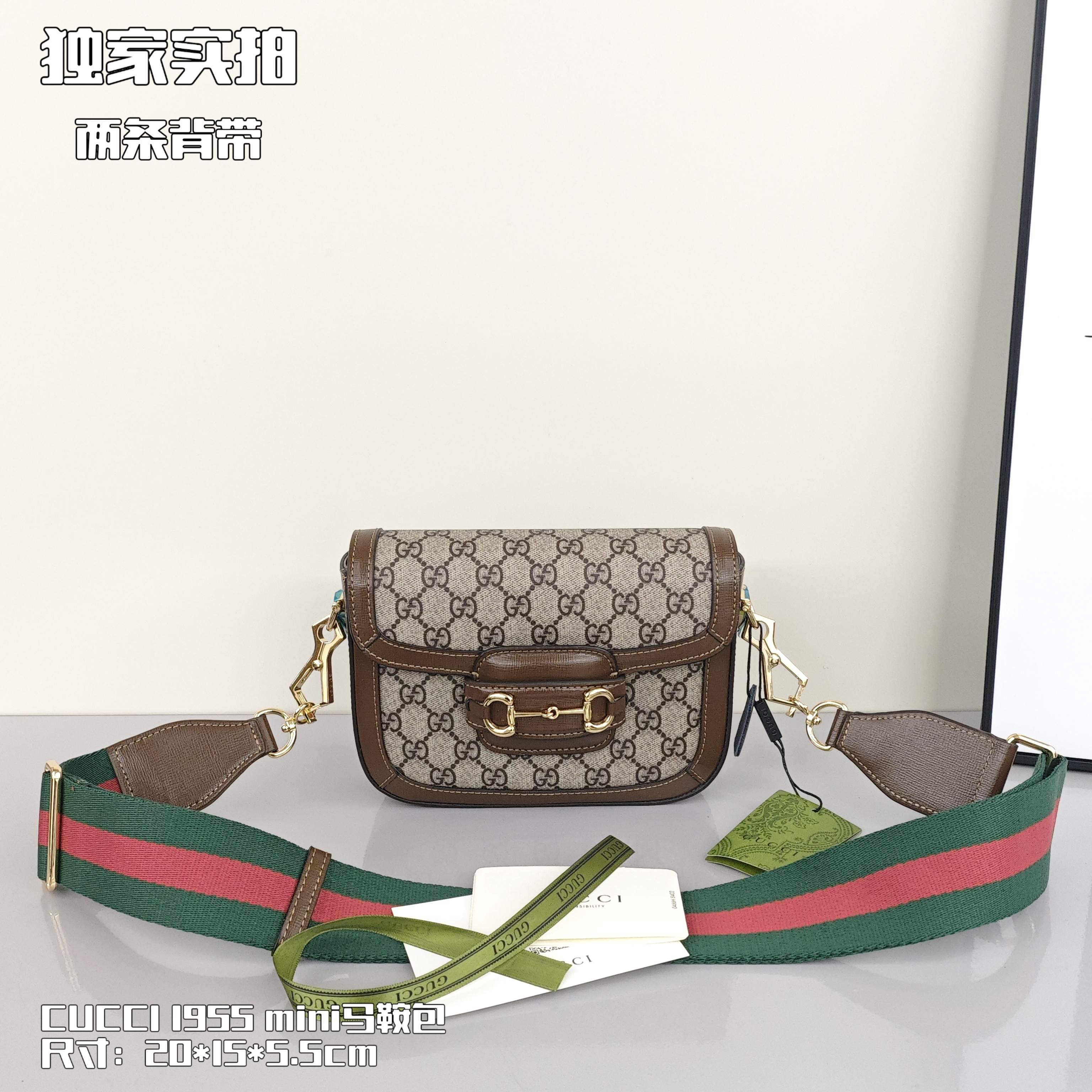Gucci 1955mini马鞍包💰300(两条肩带) 标志性的金属马衔扣,搭配经典双G图案,把复古时髦感拿捏的恰到好处,迷你款还配了两条不同风格的可拆卸肩带,调节背带长度,自由切换不同背法,一包多用,实用性很高,容量足够日常所需。 尺寸:20*15*5.5cm