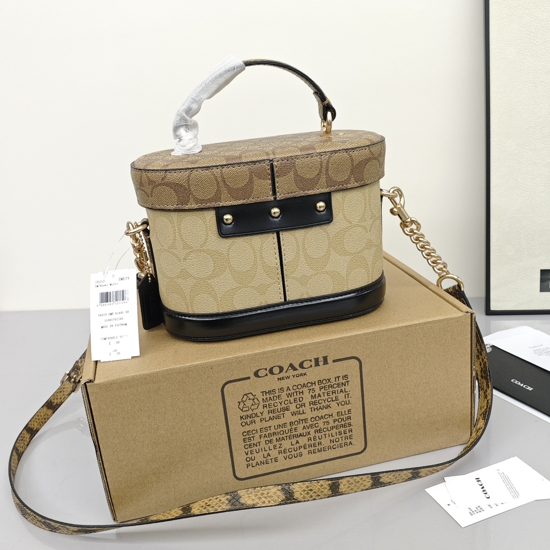 Coach蔻驰化妆盒子包💰280 借鉴历史悠久的 Cannes 化妆箱造型,以此款半硬质手袋重现昔日经典的魅力,充满蔻家传统特色的外观设计,十分雅致,配有顶部手柄和可脱卸肩带,能装又百搭,无论是中性 青春 活泼的风格都能搭。 规格:20*13*10cm