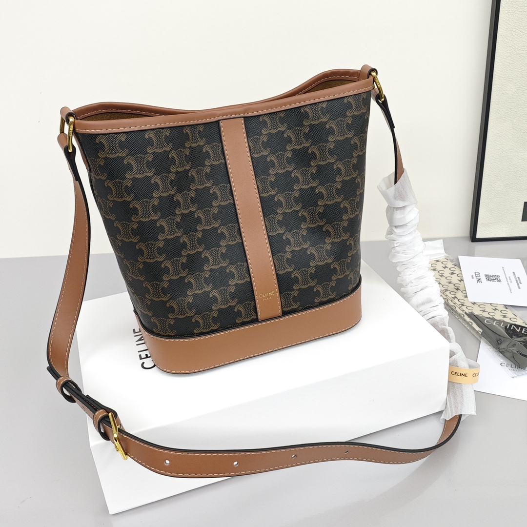 Celine赛琳水桶包💰260 万年经典凯旋门水桶包,日常通勤必入,复古风满满,包身图案由经典的凯旋门扣为设计主题,搭配棕色牛皮,容量大自重轻 单肩斜挎均可。 规格:26*22*13cm(附送丝巾)