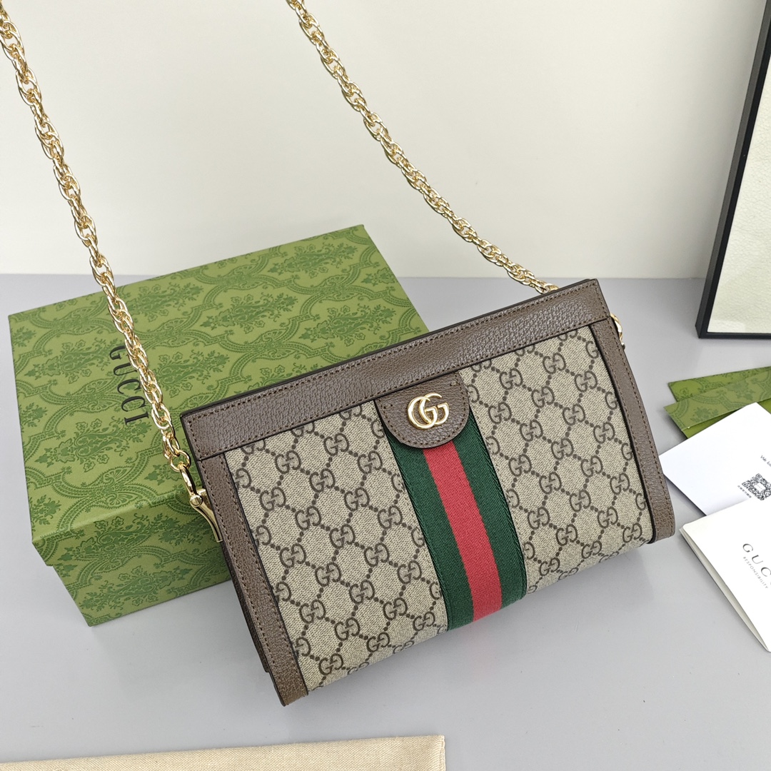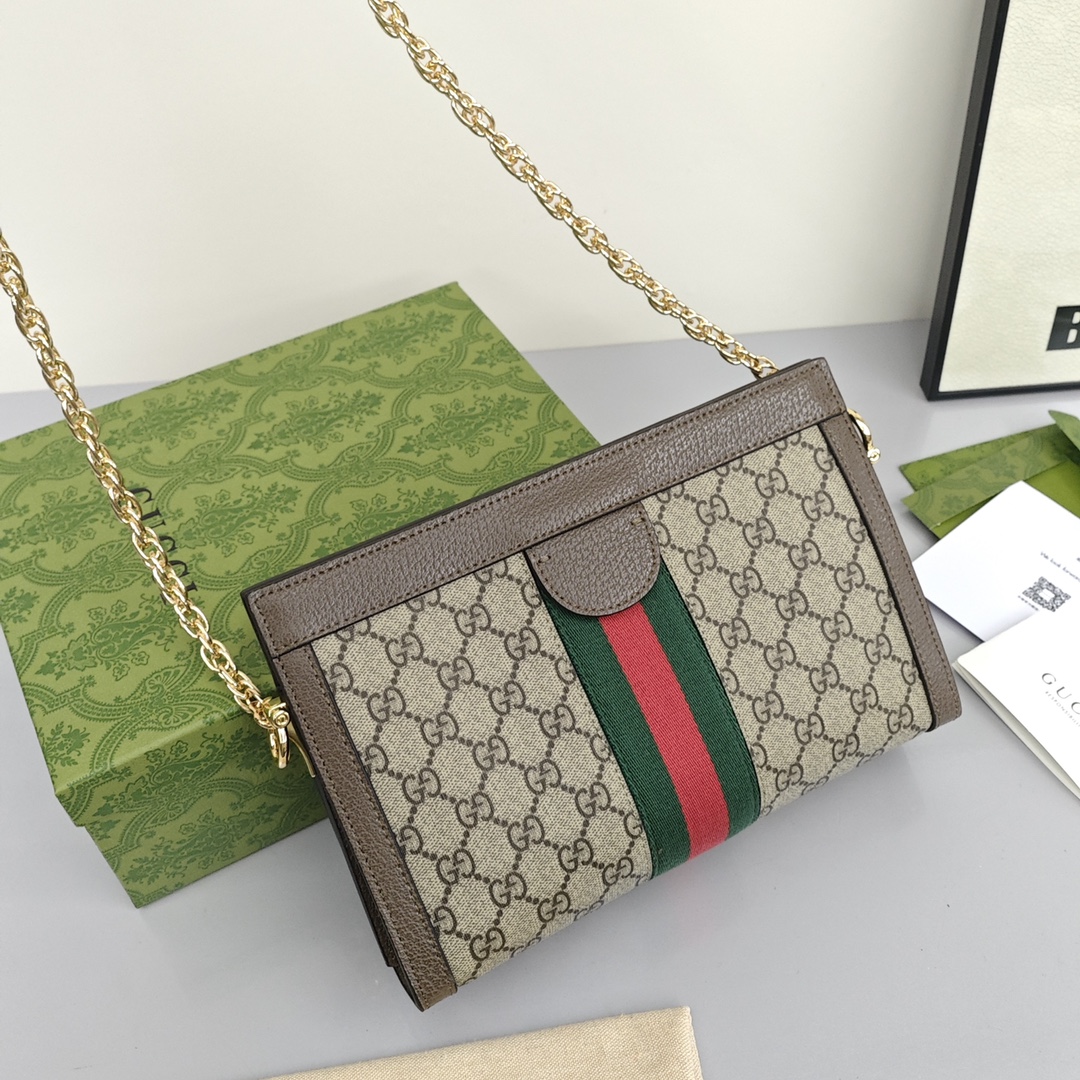 Gucci Ophidia链条包💰280 采用GGsupreme高级人造帆布,复古又经典,构造简约加上经典双G印花搭配,标志性条纹织带,原版五金链条,斜挎手拿随时转换,深受好评百搭。 规格:26*17.5*8cm