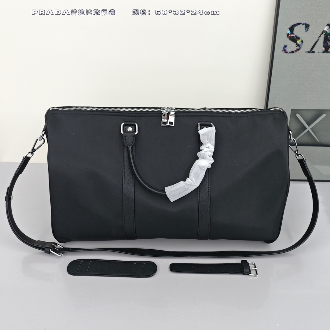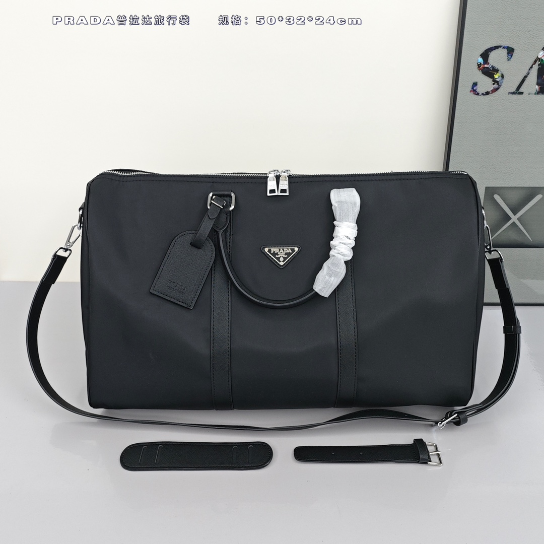 PRADA普拉达旅行袋💰280 采用进口降落伞布料,充满现代感的设计,永不过时,包身饰有标志性的三角形金属徽标,轻便又实用,旅游必备款。 规格:50*32*24cm
