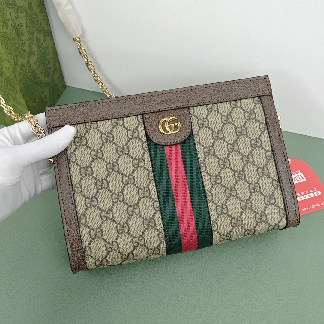 Gucci Ophidia链条包💰220 采用GGsupreme高级人造帆布,复古又经典,构造简约加上经典双G印花搭配,标志性条纹织带,原版五金链条,斜挎手拿随时转换,深受好评百搭。 规格:26*17.5*8cm