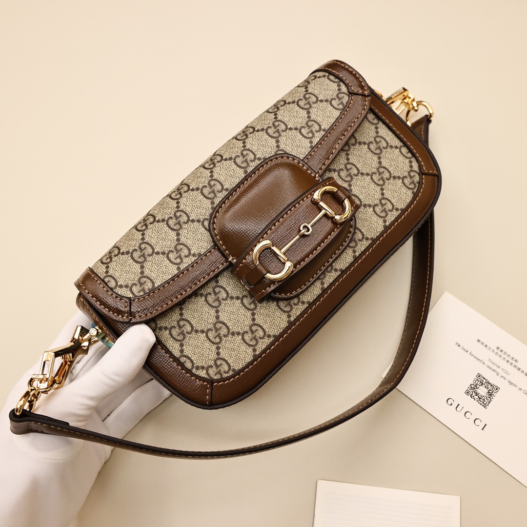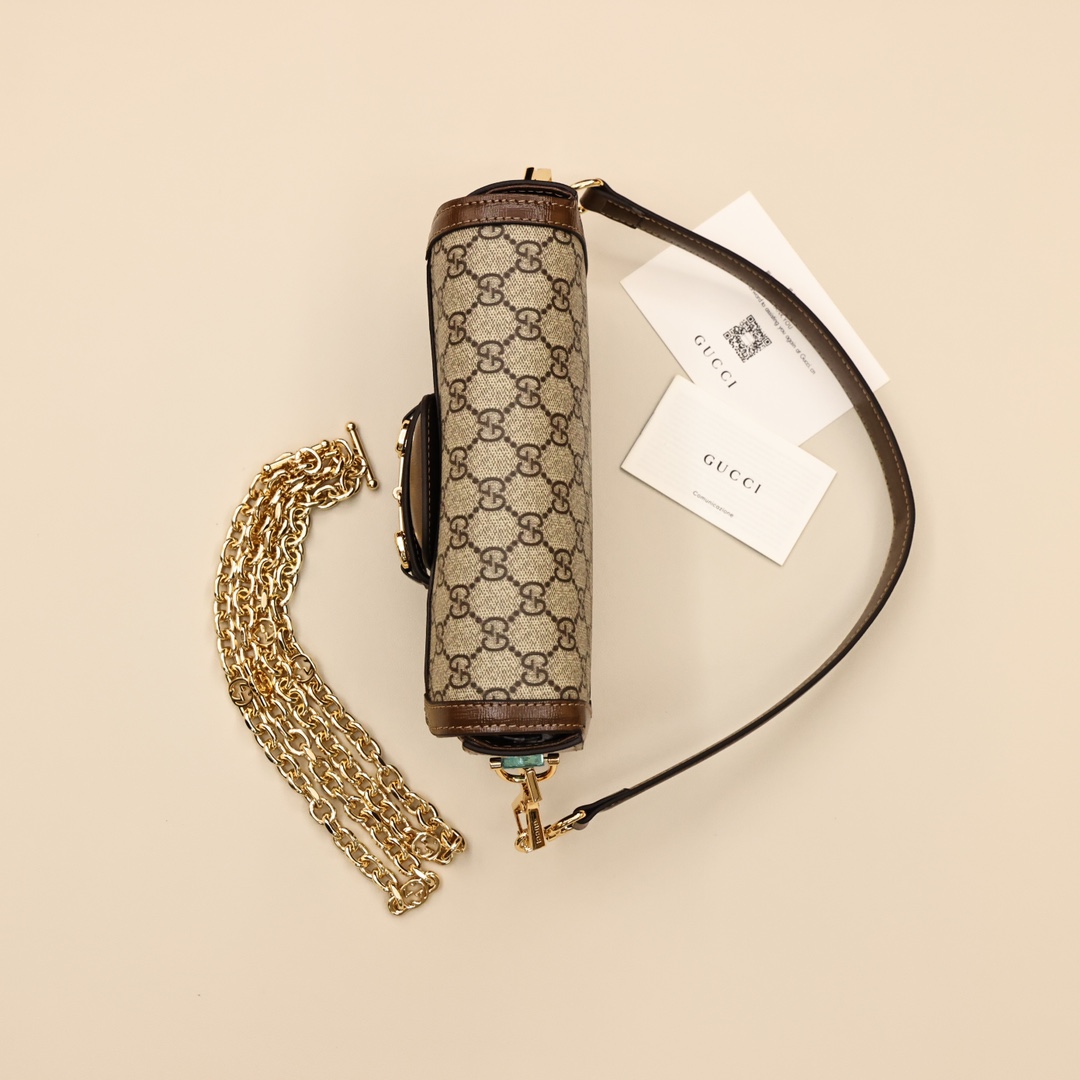 Gucci 1955法棍包💰300 在原有的经典马鞍包设计上缩小比例,包型更加小巧精致,配了一根超美的双G logo金色链条,尽显复古摩登之美,容量满足日常需求。 规格:24*13*6cm