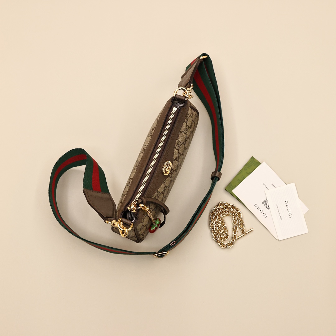 Gucci Ophidia 草莓麻将包💰280 晶莹剔透的小草莓吊坠,这就是心动的感觉,一包多用,腋下背是一根链条带,斜挎背用长肩带,整个包包复古感十足且百搭。 手拎+斜挎+腋下包, 一只包包满足三个愿望~ 规格:25*15*6.5cm