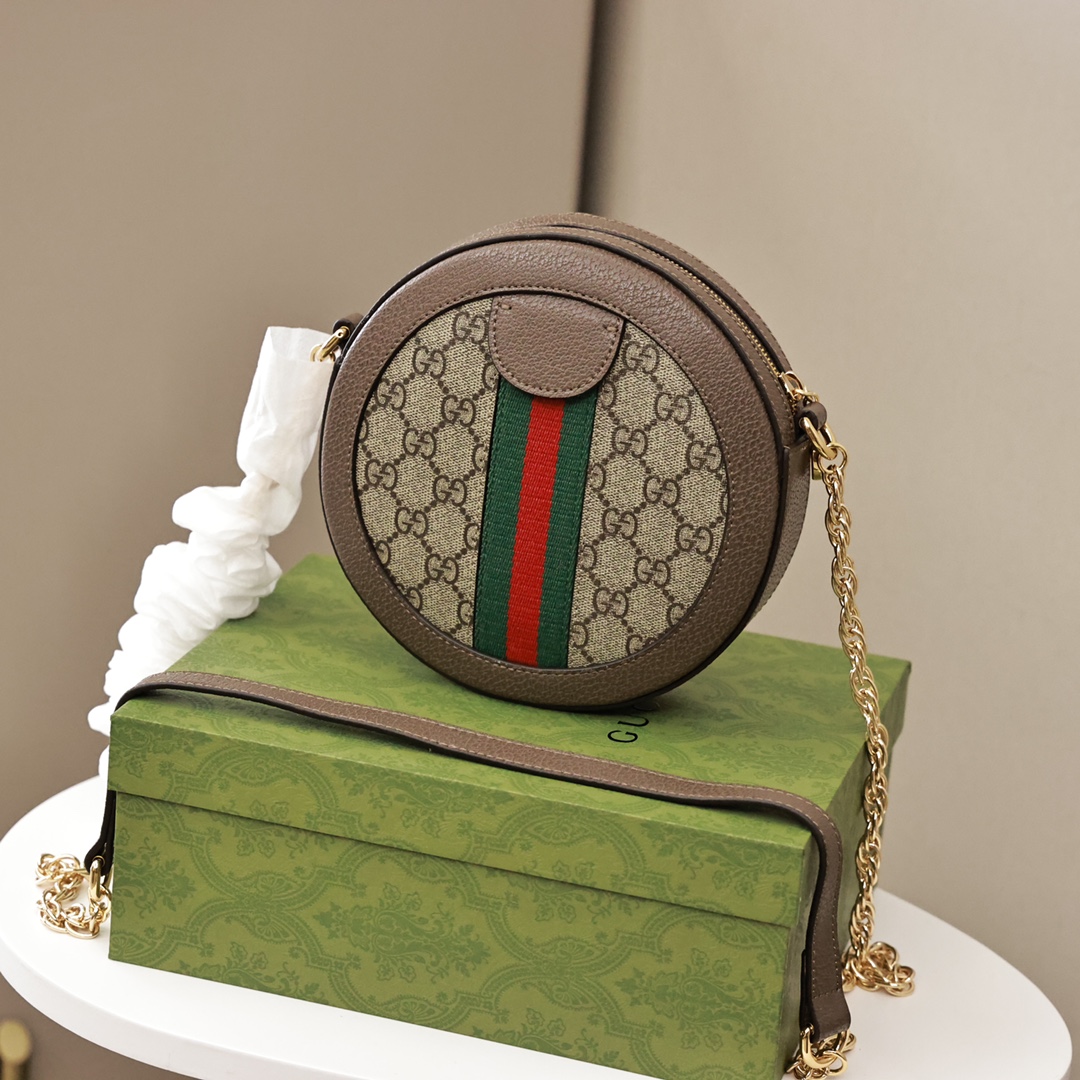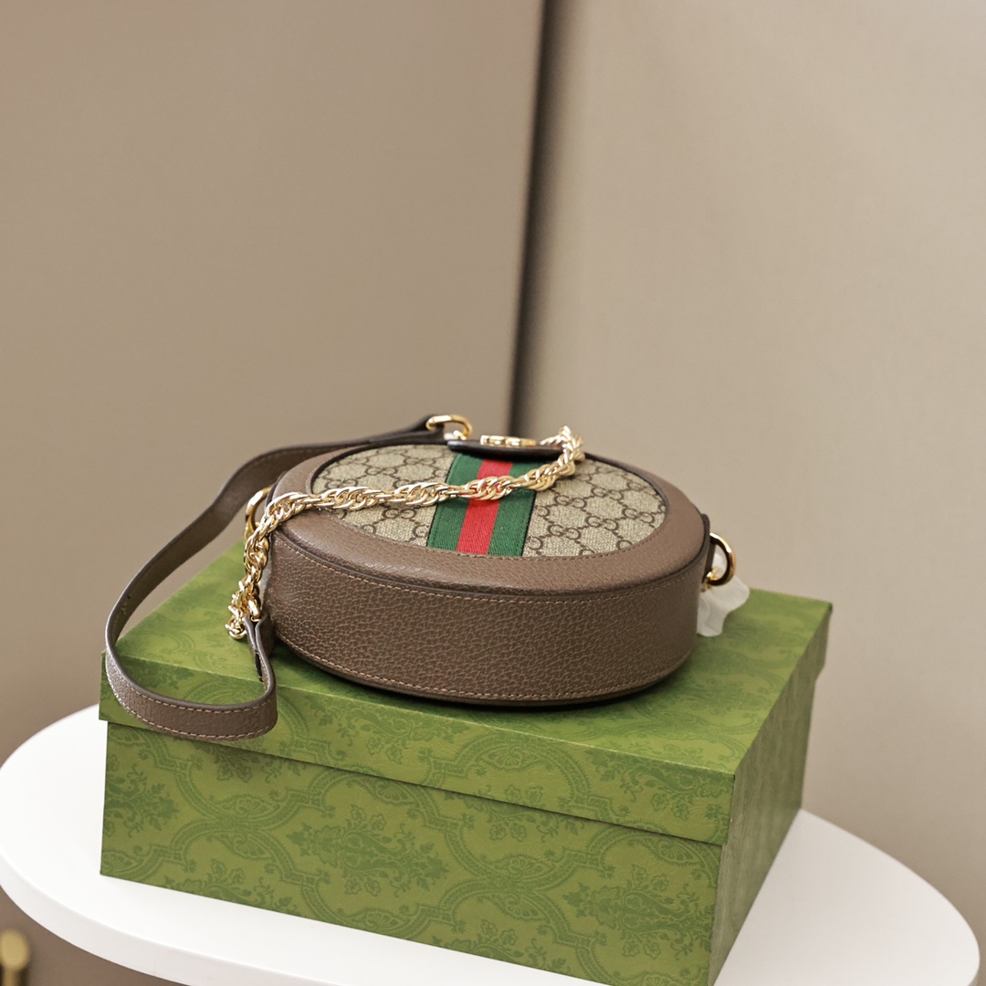 Gucci Ophidia圆饼包💰210 采用GG Supreme高级人造帆布制作,镶嵌红绿条纹织带,小巧玲珑的双G图案是源自70年代的Gucci典藏设计,装饰包身的皮革饰片细节和拉链头,高端版本。 规格:18*18*4.5cm