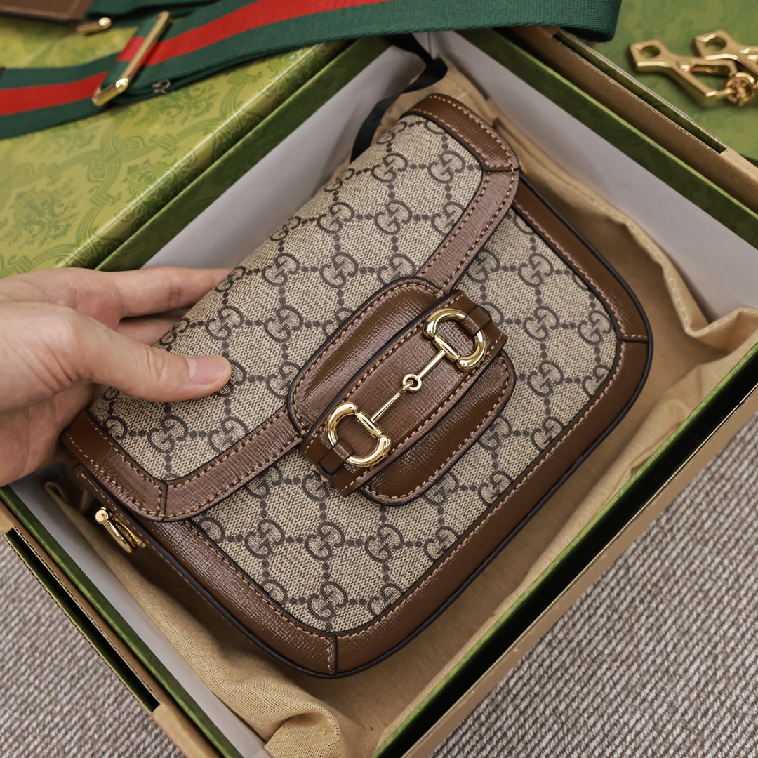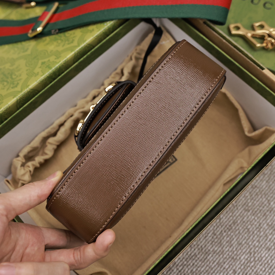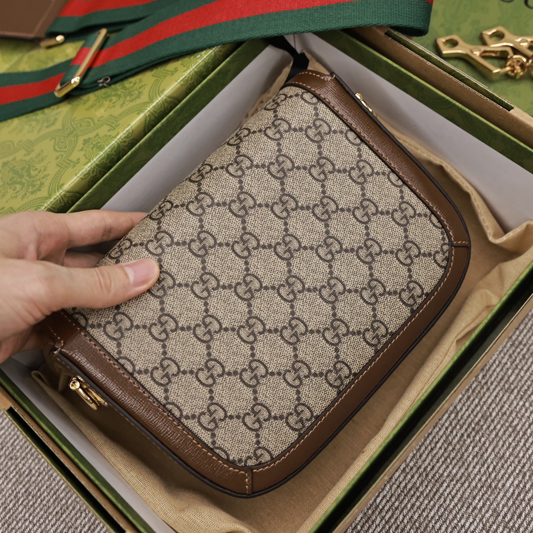 GUCCI1955迷你马鞍包💰300 为这一复古风格系列增添了混搭格调.【这款迷你手袋配有两根不同的肩带】搭配同色调皮革肩带可呈现出低调优雅的气息.搭配红绿织带肩带则突显强大的品牌标识内涵.手袋采用双G字母交织图案帆布制作.饰以棕色皮革滚边. 规格:20.5*14.5*5.5cm