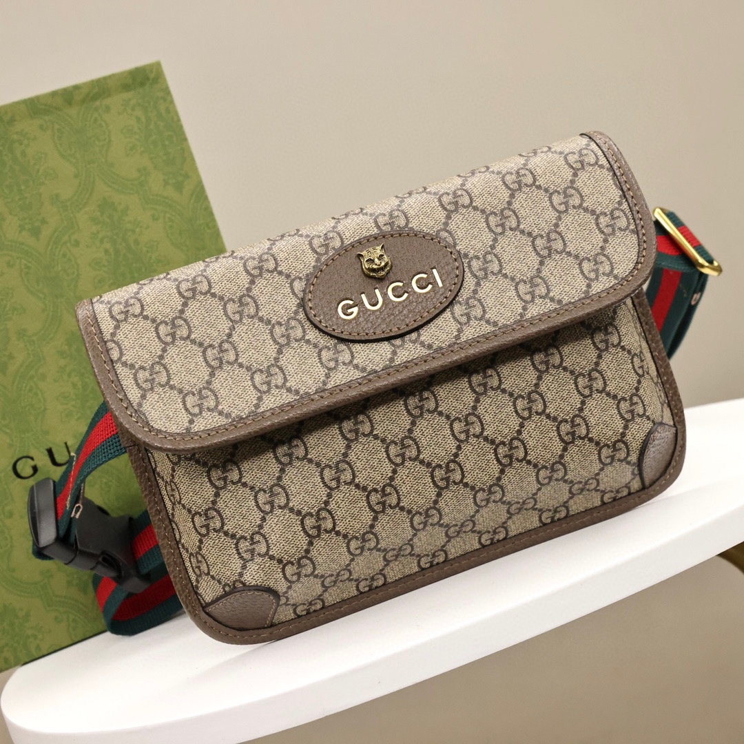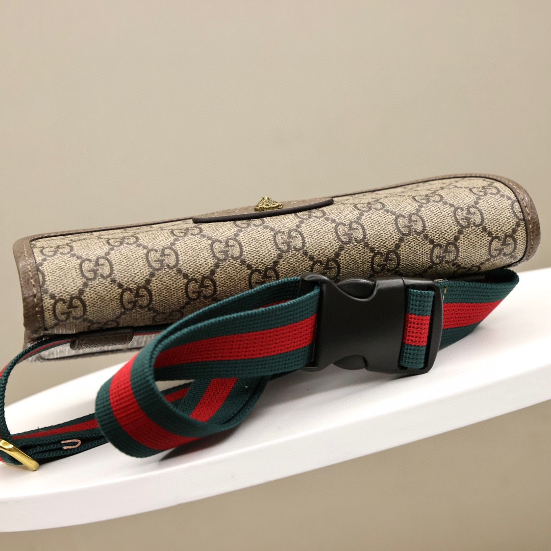 GUCCI 虎头腰包💰190【独家定制版】 男女通用款.采用GG Supreme高级人造帆布制作.配以复古风格设计.款式采用皮革滚边.可以缠腰佩戴.配以织带和搭扣确保安全. 规格: 24*16.5*3.5cm