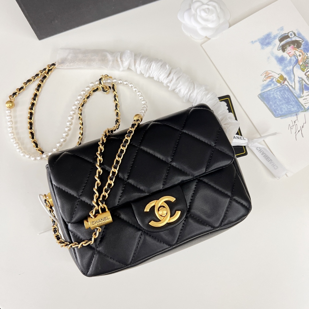 香奈儿最新爆款珍珠方胖子💰240 羊皮配珍珠链条.经典菱格口盖包.饰以金色链子与按钮设计坠饰.肩带可调节长短.香润饰手袋.脱颖而出.演绎永恒的优雅. 规格:19*13*6cm