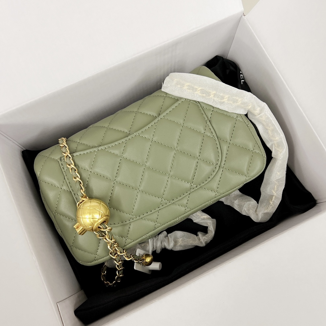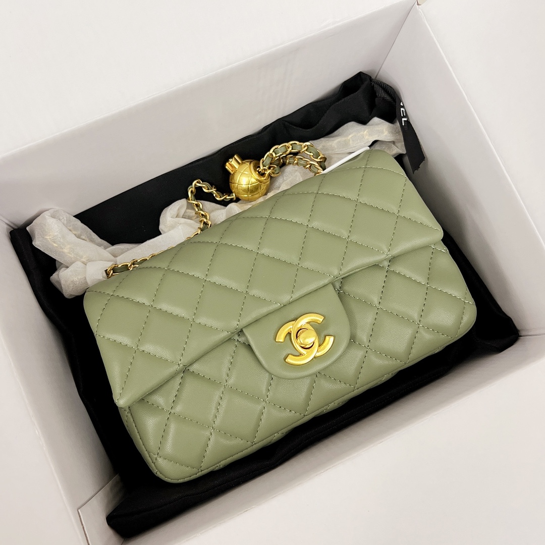 香奈儿金球链条包💰220(芥末绿) 全套免税包装.规格:20*13*7cm 新款链条包.手感超级好.以华丽高贵的外形成为当下最炙手可热之作.人手必备.明星热捧.精匠之作. 小金球可调节肩带长度.