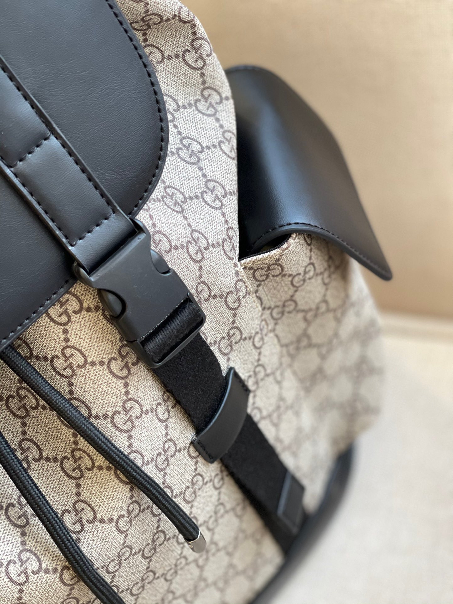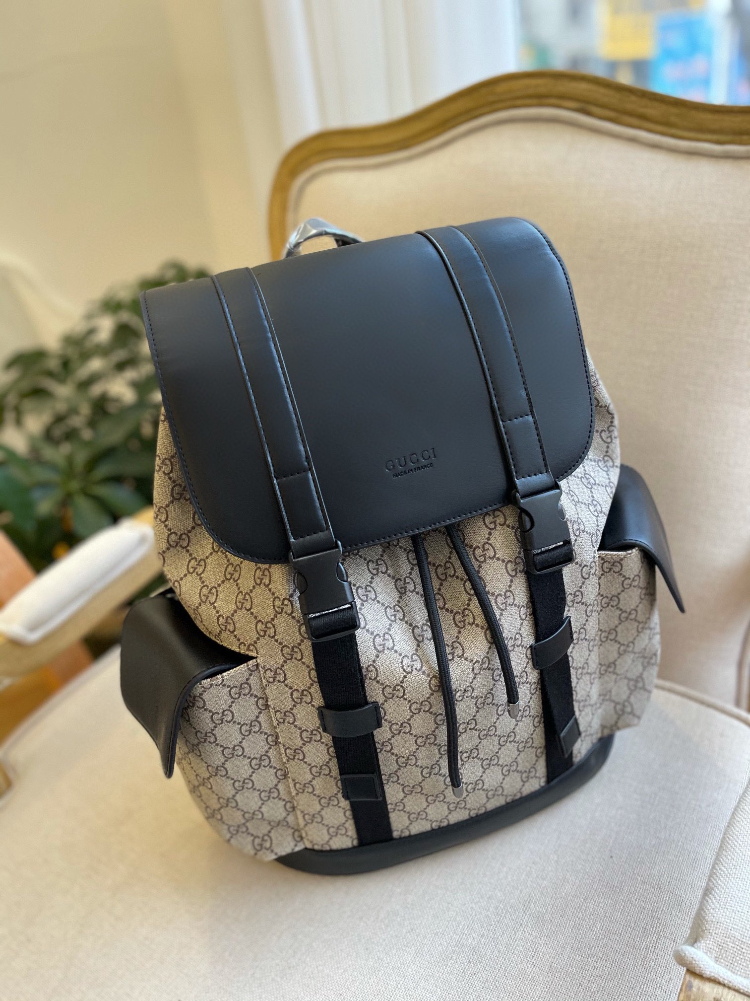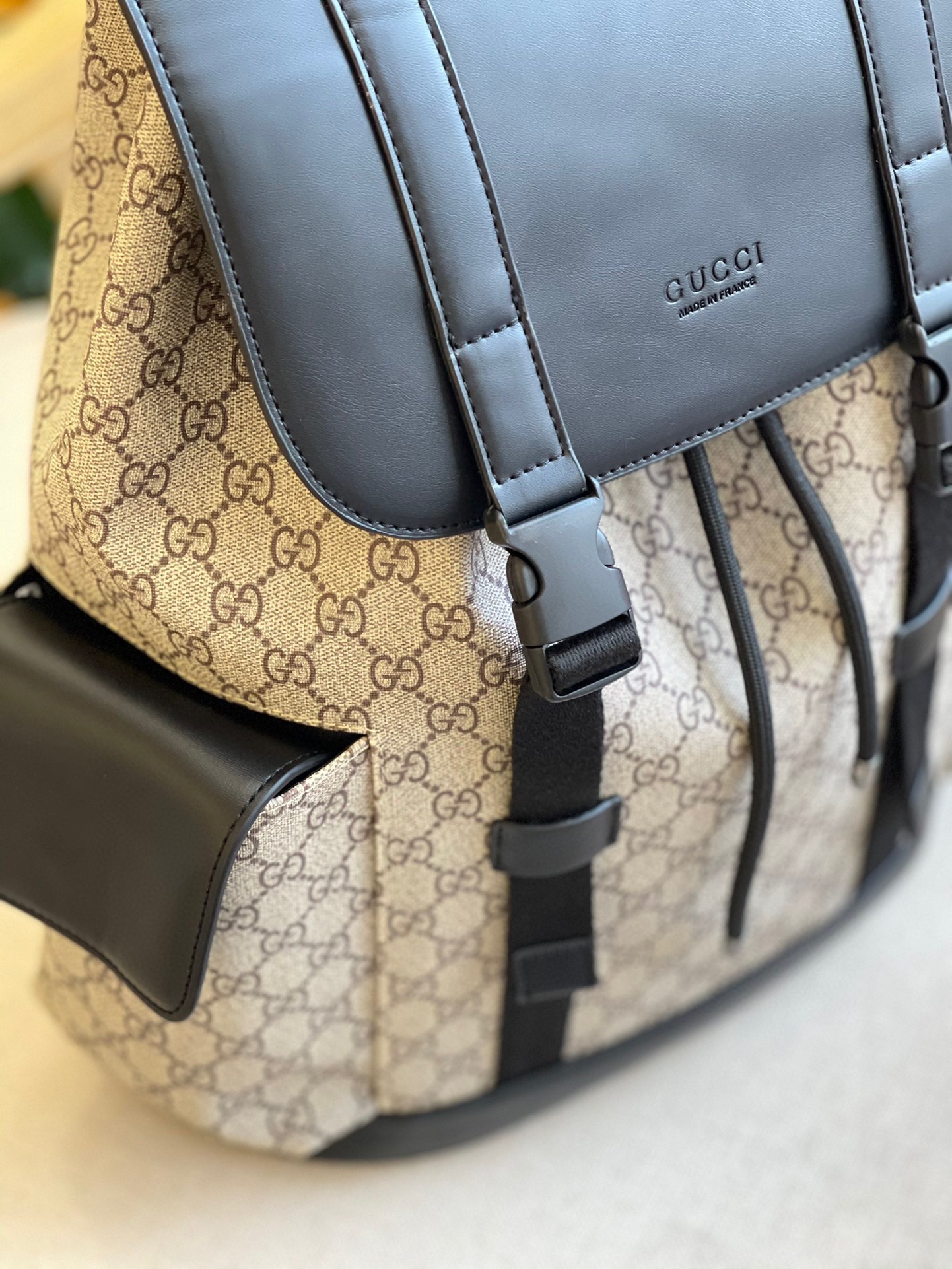 GUCCI男士双肩包 💰260 双G印花帆布拼皮休闲旅游背包. 超火爆款 旅行外出必备神器. 型男格调 匠心复刻 奢华平民价 厚实肩带 超大容量 内里空间特别大. 外两口袋可放置香烟.充电器等日常用品. 规格:42*33cm